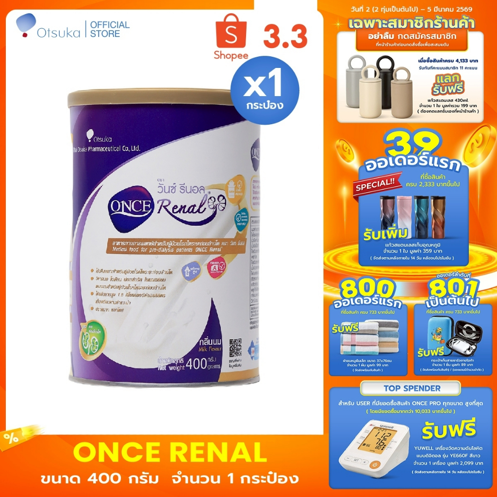 ONCE Renal Milk Flavor 400 g. วันซ์ รีนอล กลิ่นนม 400 g. อาหารสำหรับผู้ป่วยโรคไตระยะก่อนล้างไต จำนวน 1 กระป๋อง