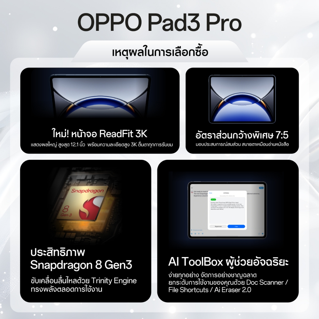 OPPO Pad3 Pro (12+256G) | แท็บเลต Snap8 Gen3 หน้าจอ 12.1 นิ้ว ชาร์จไว 67W แบตเตอรี่ 9510 mAh รับประกัน 12 เดือน