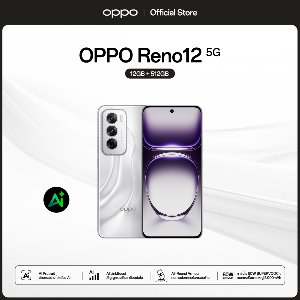 OPPO Reno12 5G(12+512) | โทรศัพท์มือถือAI Portrait, AI Linkboost กล้อง 50 MP ชาร์จไว 80W แบตเตอรี่ 5000mAh