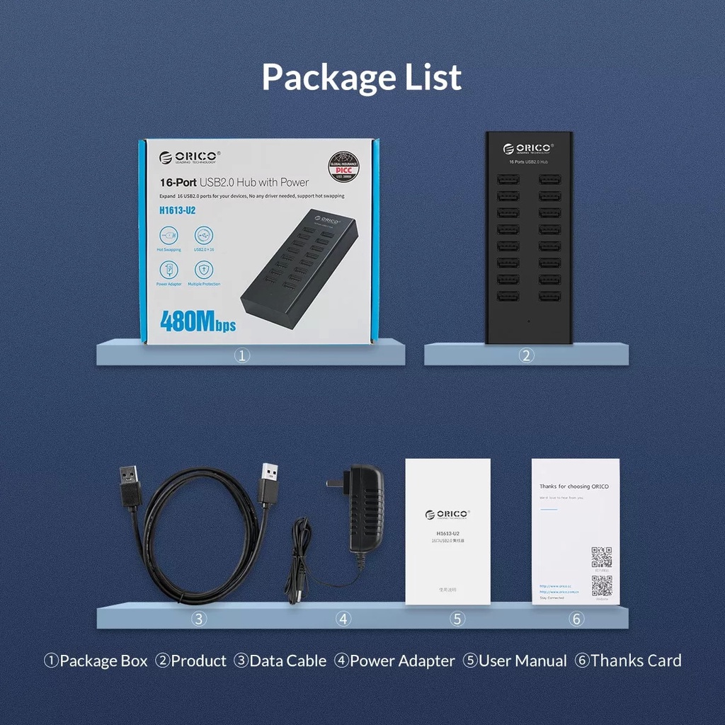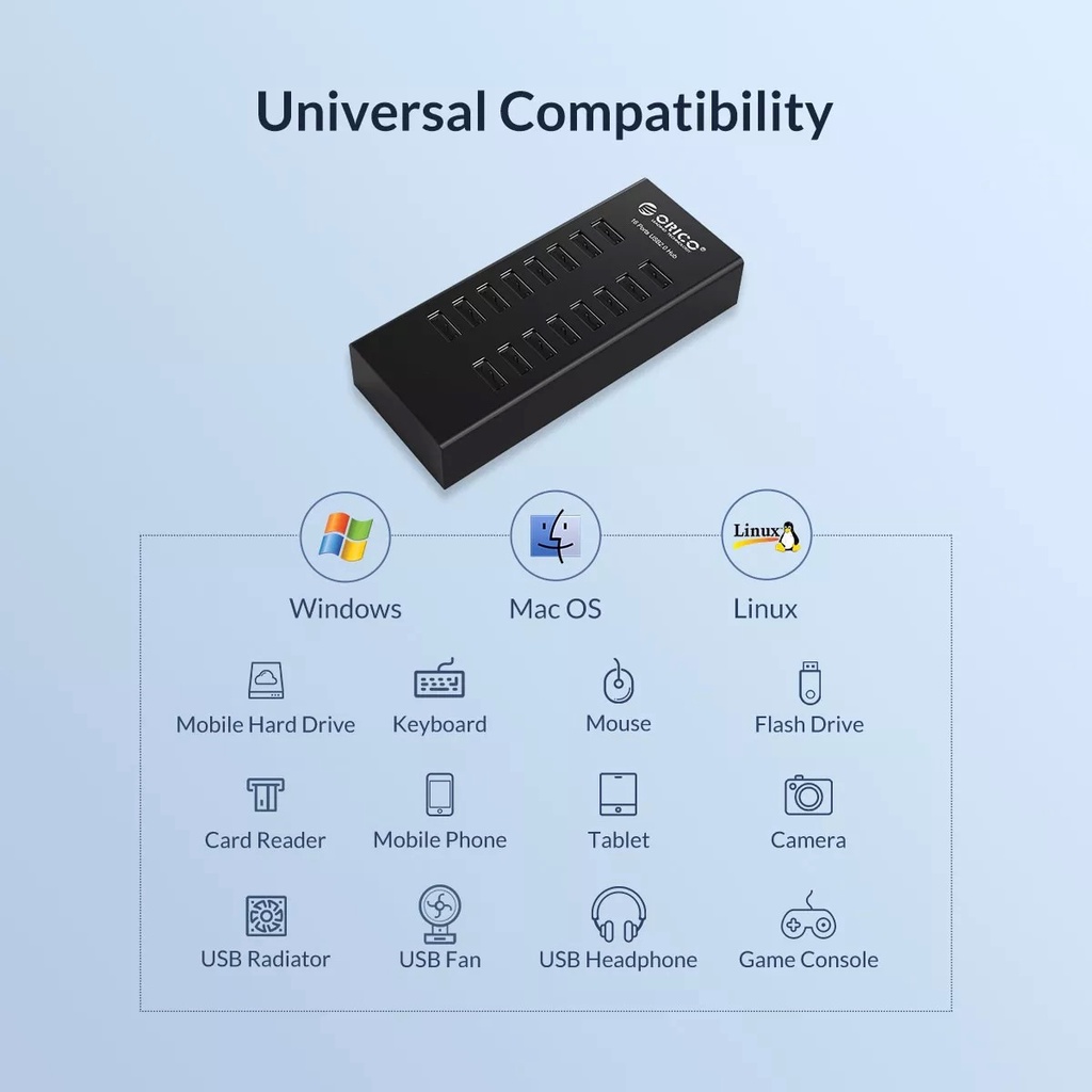 ORICO(H1613-U2,US Plug) 16 Ports USB Hub With Power Adapter USB Multiple Extension Industrial Testing Port Expander