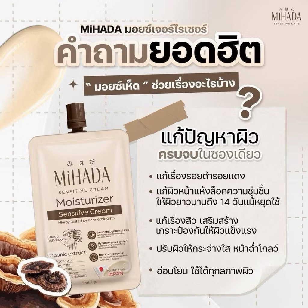 (1 ซอง)MIHADA มิฮาดะ มอยส์เห็ด มอยซ์เจอร์ไรเซอร์เนื้อครีม Moisturizer Sensitive Cream 7 กรัม