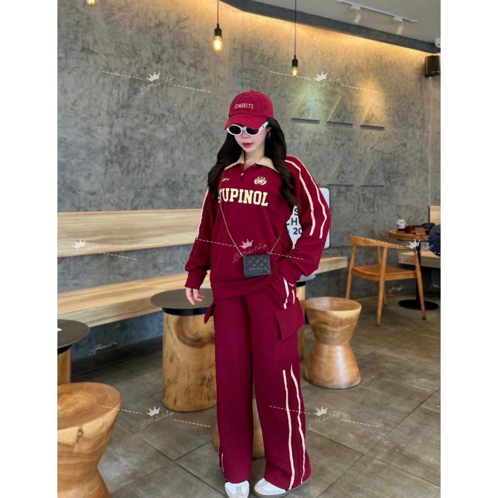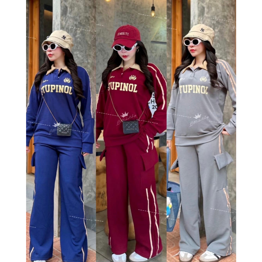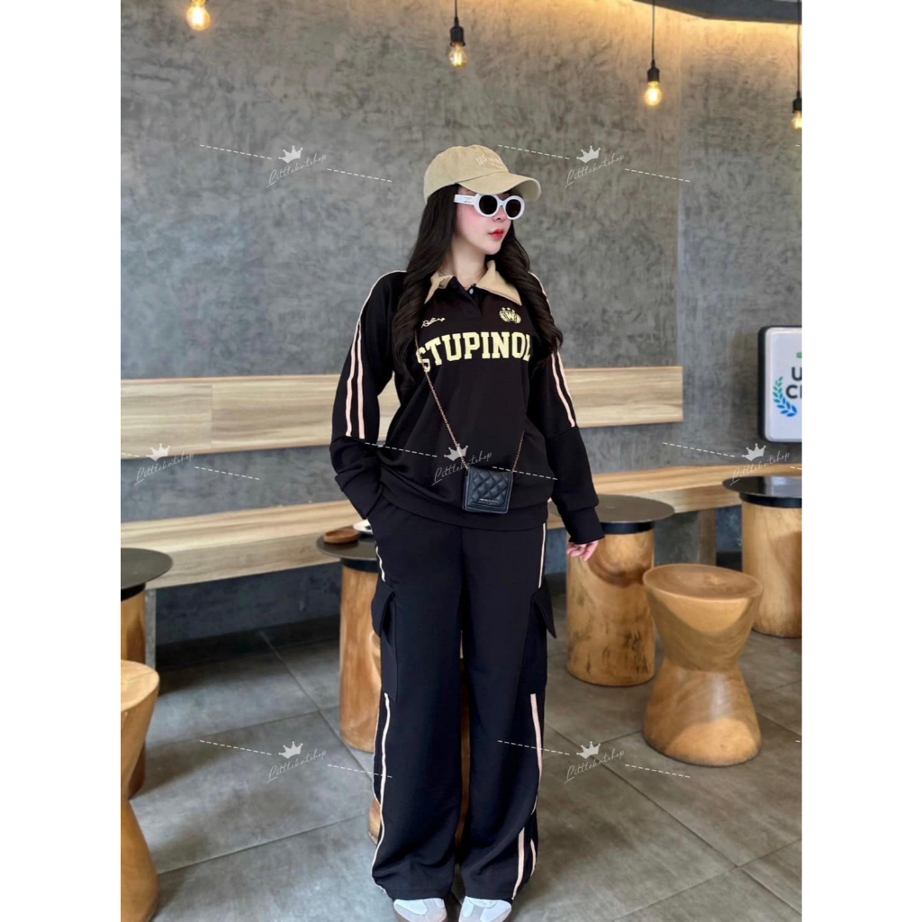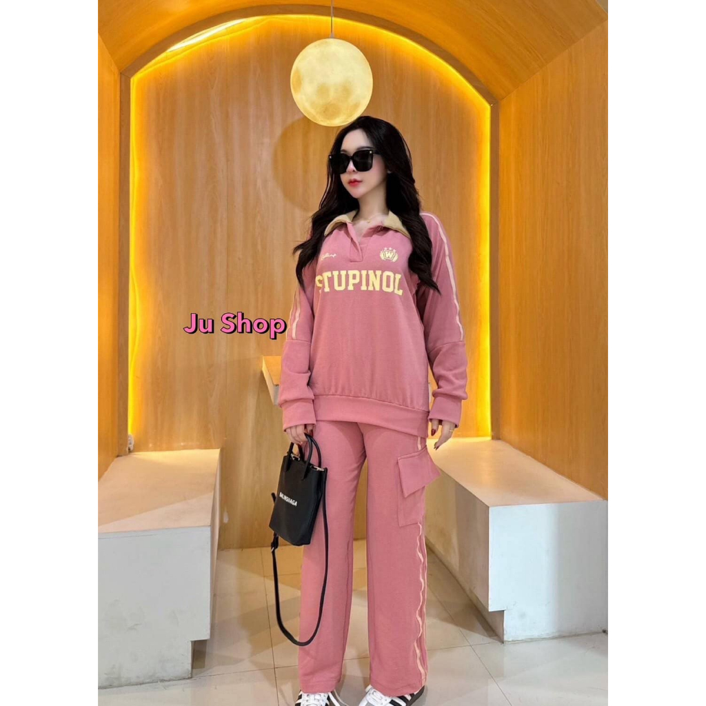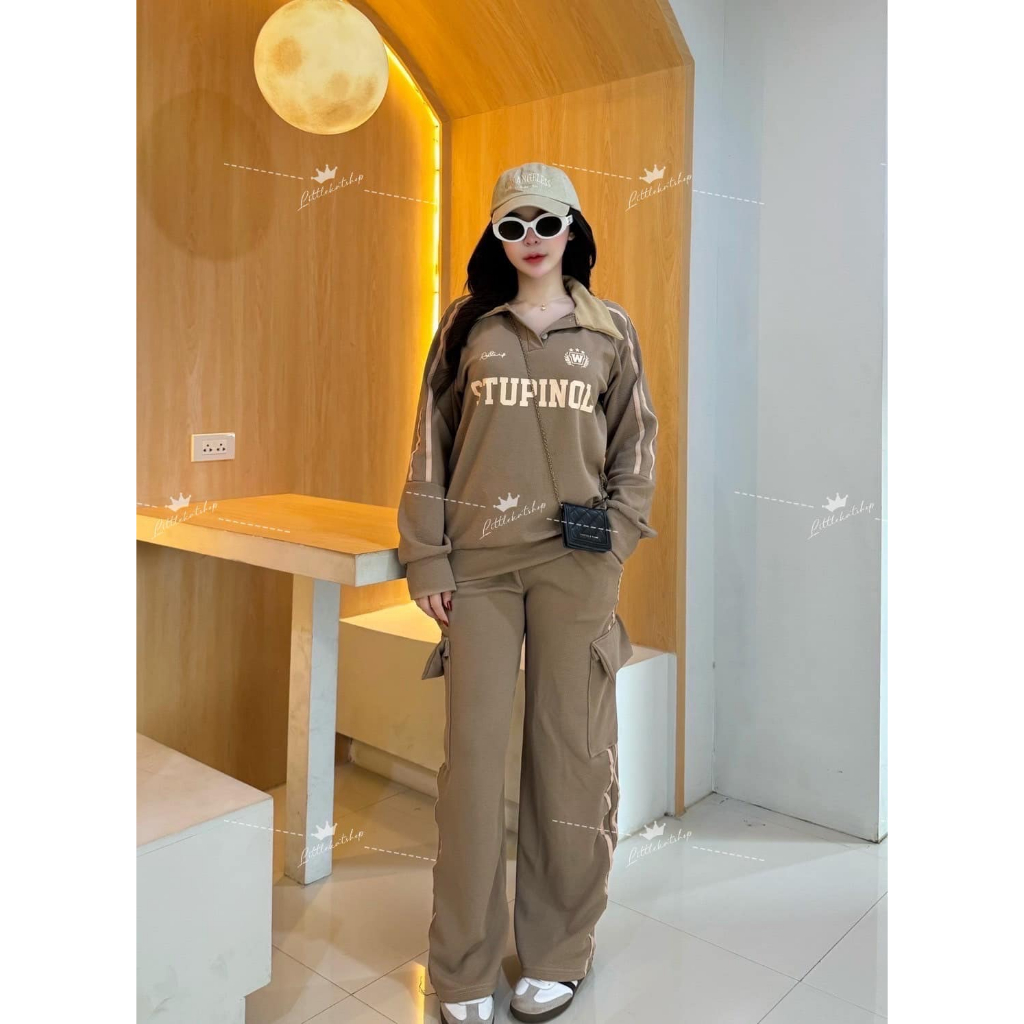 OT ชุดเซ็ต 2 ชิ้น ผ้าวอมวูลเวฟ เสื้อทรงสเวตเตอร์แขนยาวคอปกแต่งกระดุม มีแถบข้าง + กางเกงคาโก้ขายาวแต่งแถบกระเป๋า 4 จุด