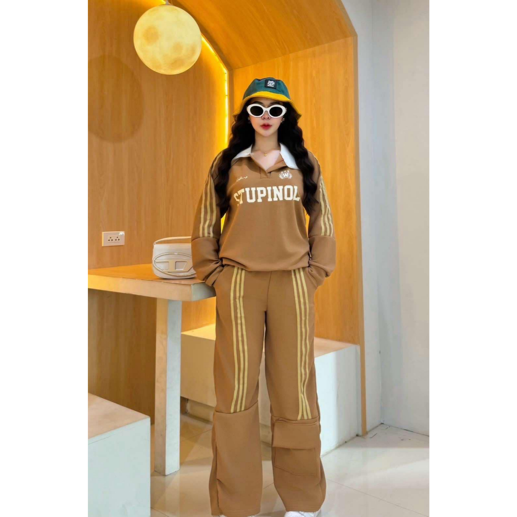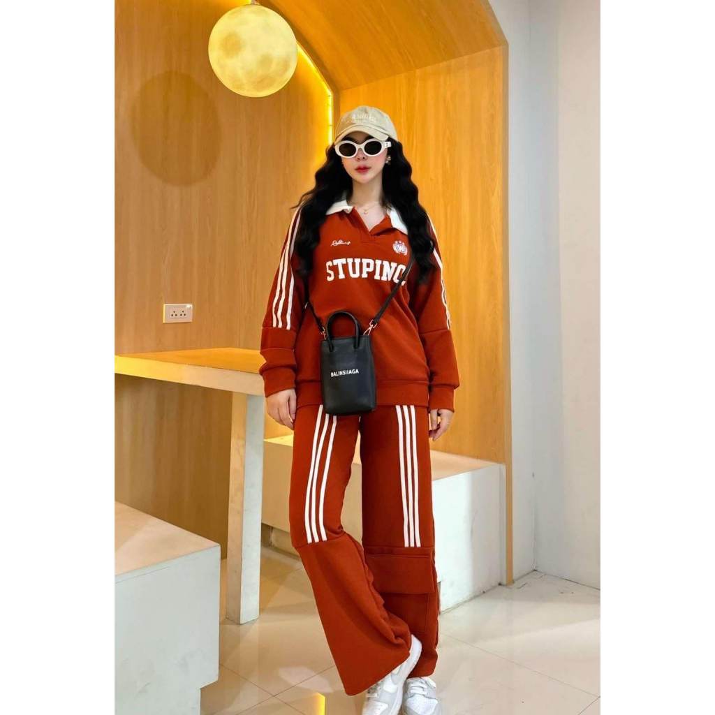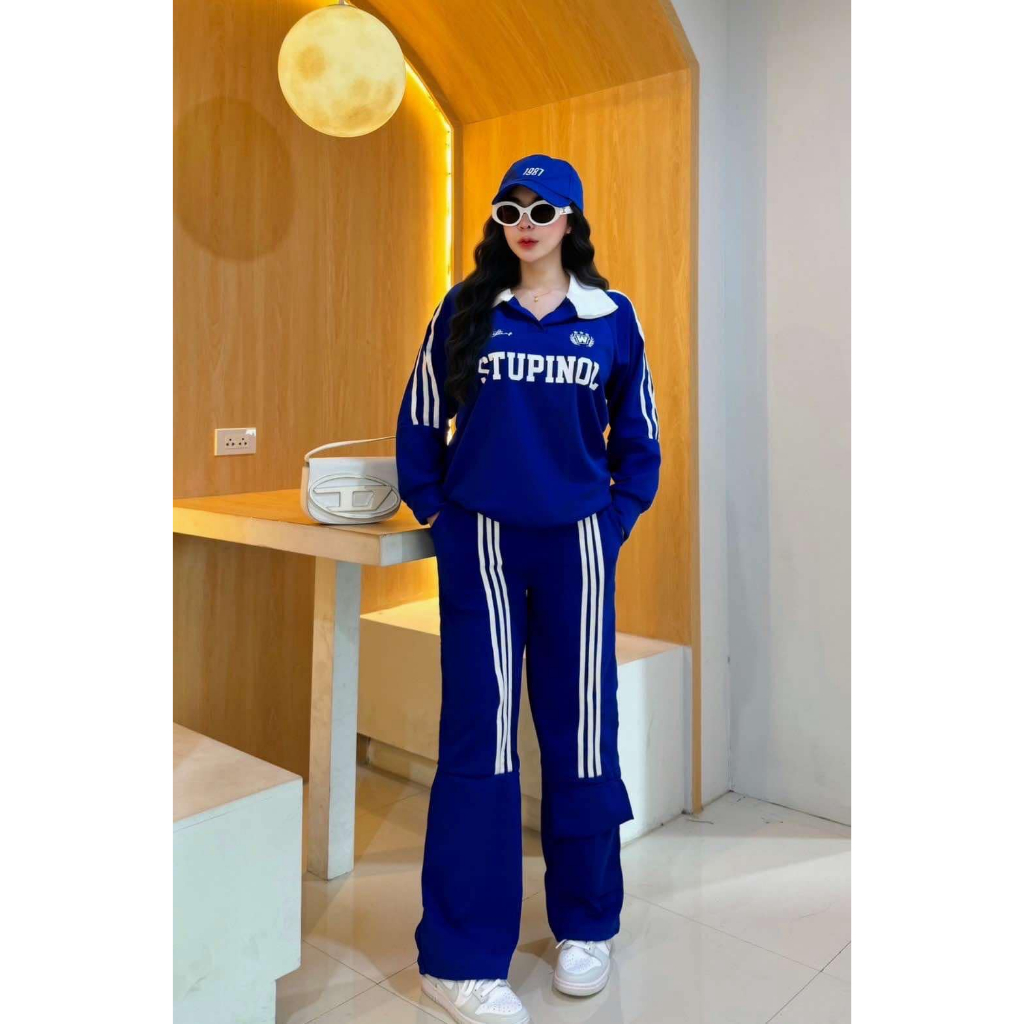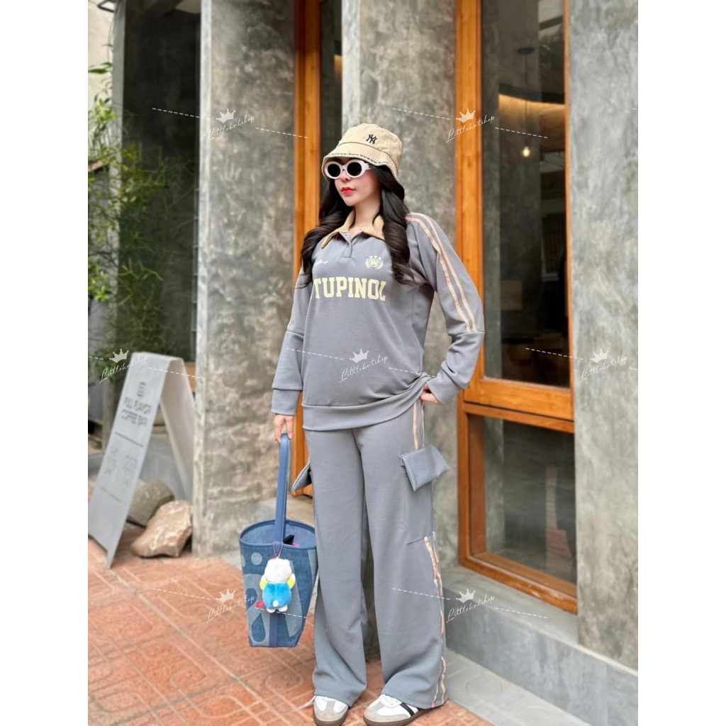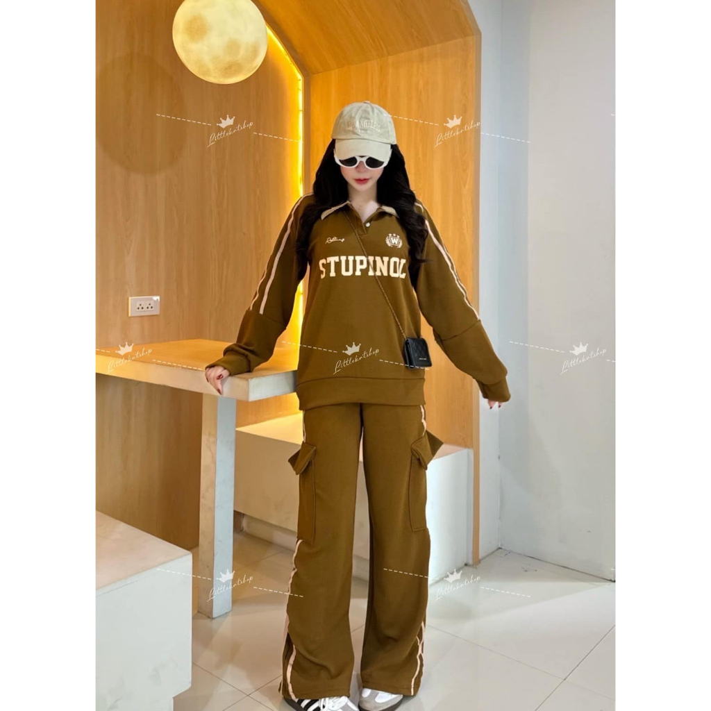OT ชุดเซ็ต 2 ชิ้น ผ้าวอมวูลเวฟ เสื้อทรงสเวตเตอร์แขนยาวคอปกแต่งกระดุม มีแถบข้าง + กางเกงคาโก้ขายาวแต่งแถบกระเป๋า 4 จุด