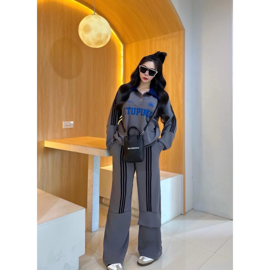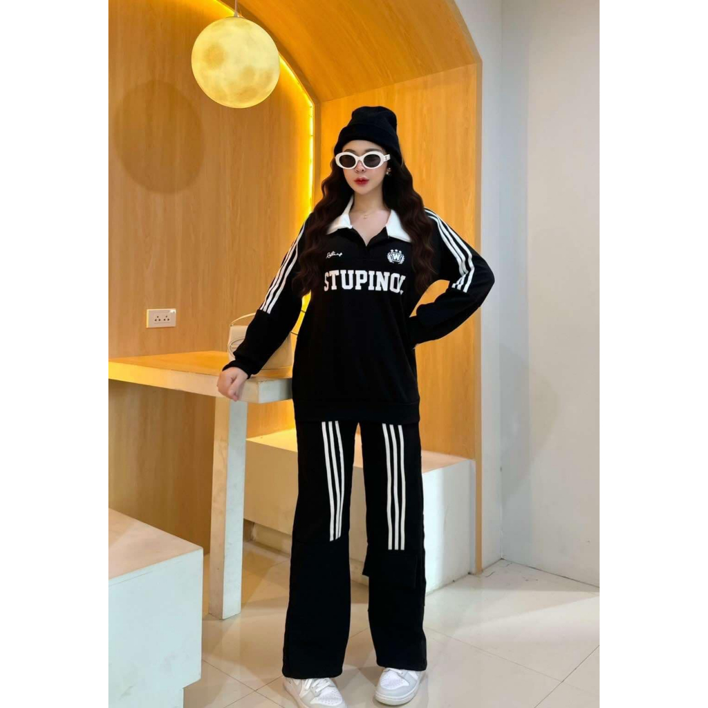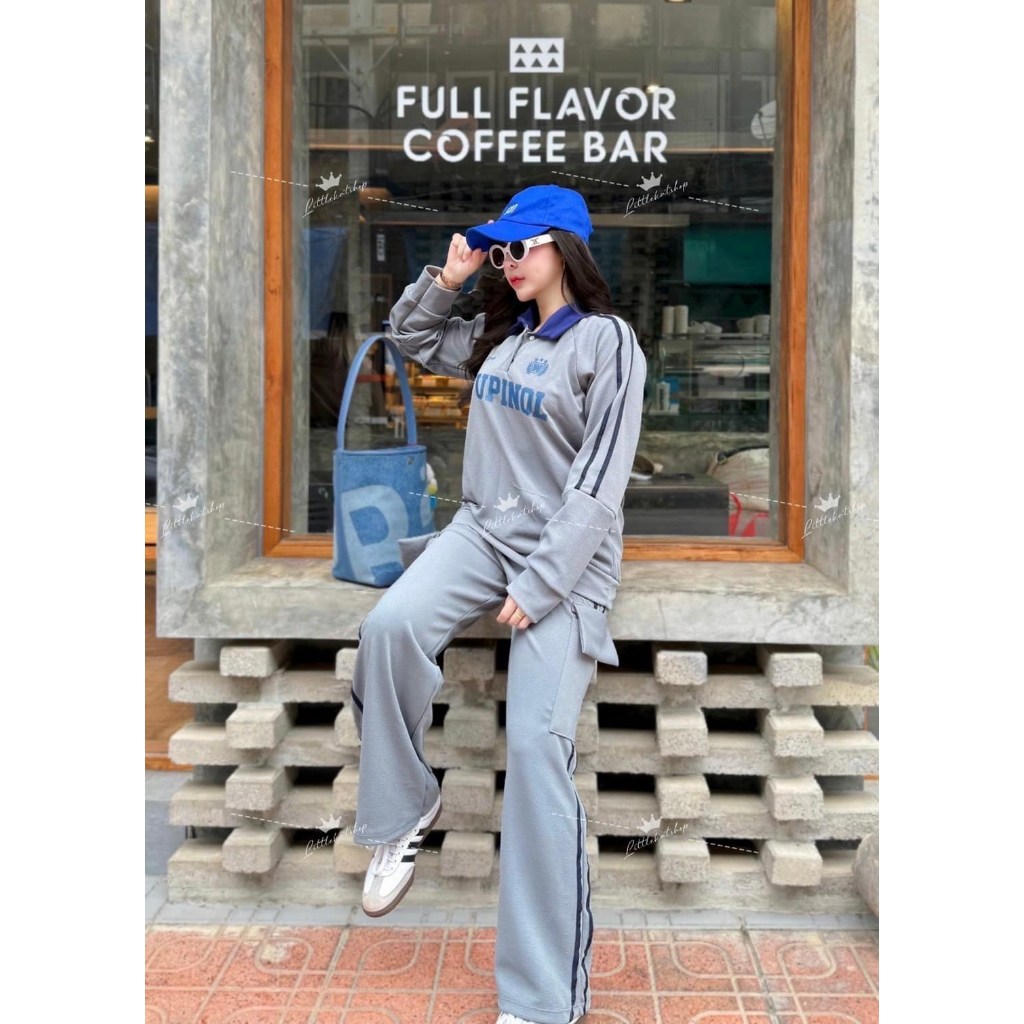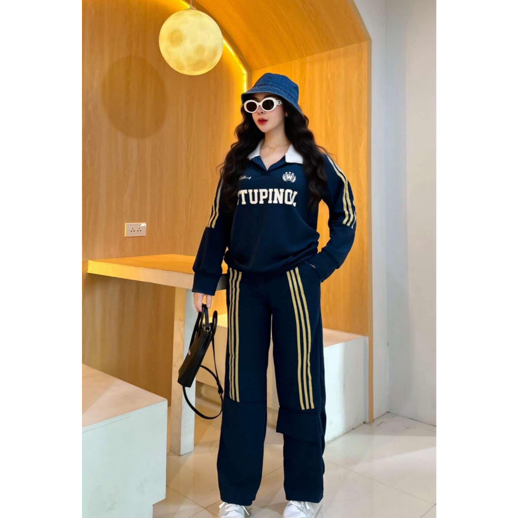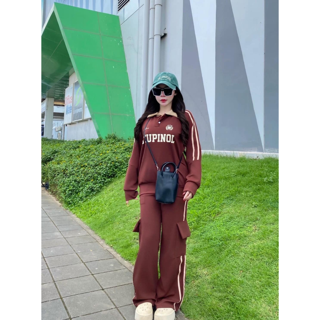OT ชุดเซ็ต 2 ชิ้น ผ้าวอมวูลเวฟ เสื้อทรงสเวตเตอร์แขนยาวคอปกแต่งกระดุม มีแถบข้าง + กางเกงคาโก้ขายาวแต่งแถบกระเป๋า 4 จุด