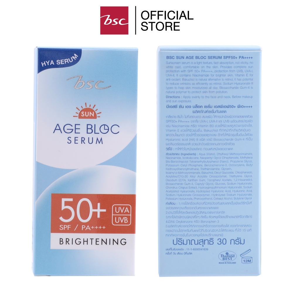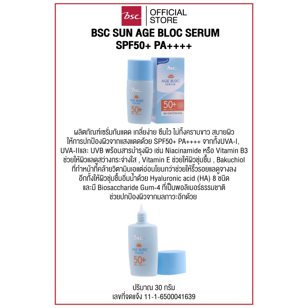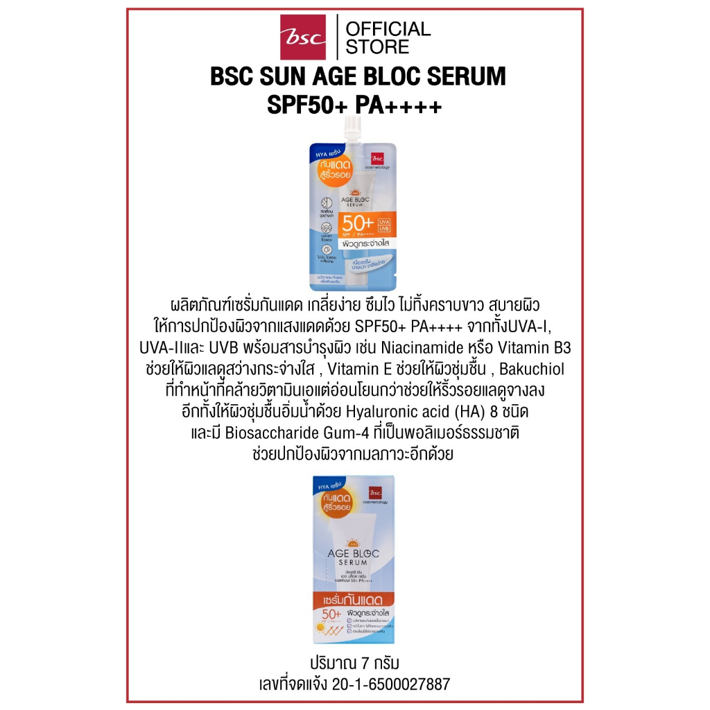 BSC SUN AGE BLOC SERUM SPF50+ PA++++ บีเอสซี ซัน เอจ บล็อก เซรั่ม เอสพีเอฟ50+ พีเอ++++ ผลิตภัณฑ์เซรั่มกันแดด เกลี่ยง่าย