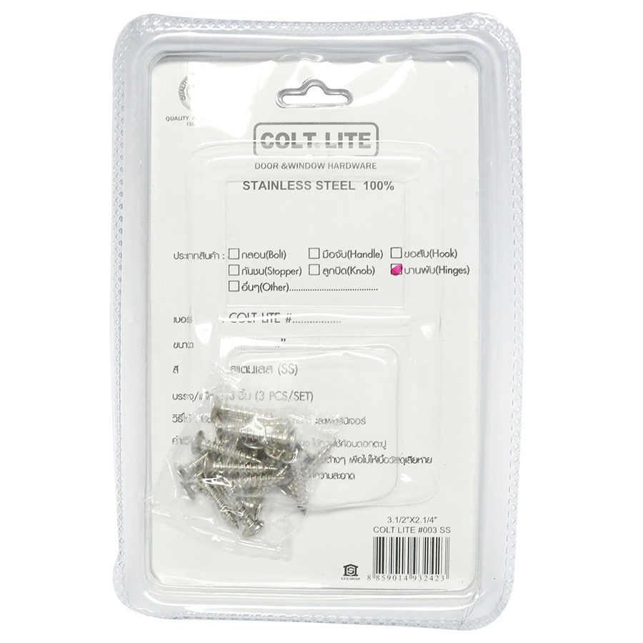 COLT บานพับสเเตนเลส COLT LITE #003 SS 3.1/2x2.1/4 หนา 1.5mm. 3ชิ้น/แพ็ค