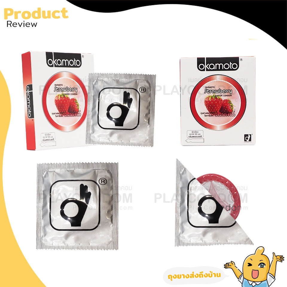 Okamoto Strawberry ถุงยางอนามัย กลิ่นสตรอเบอร์รี่ ผิวเรียบ ขนาด 53 มม. บรรจุ 1 กล่อง (2 ชิ้น)