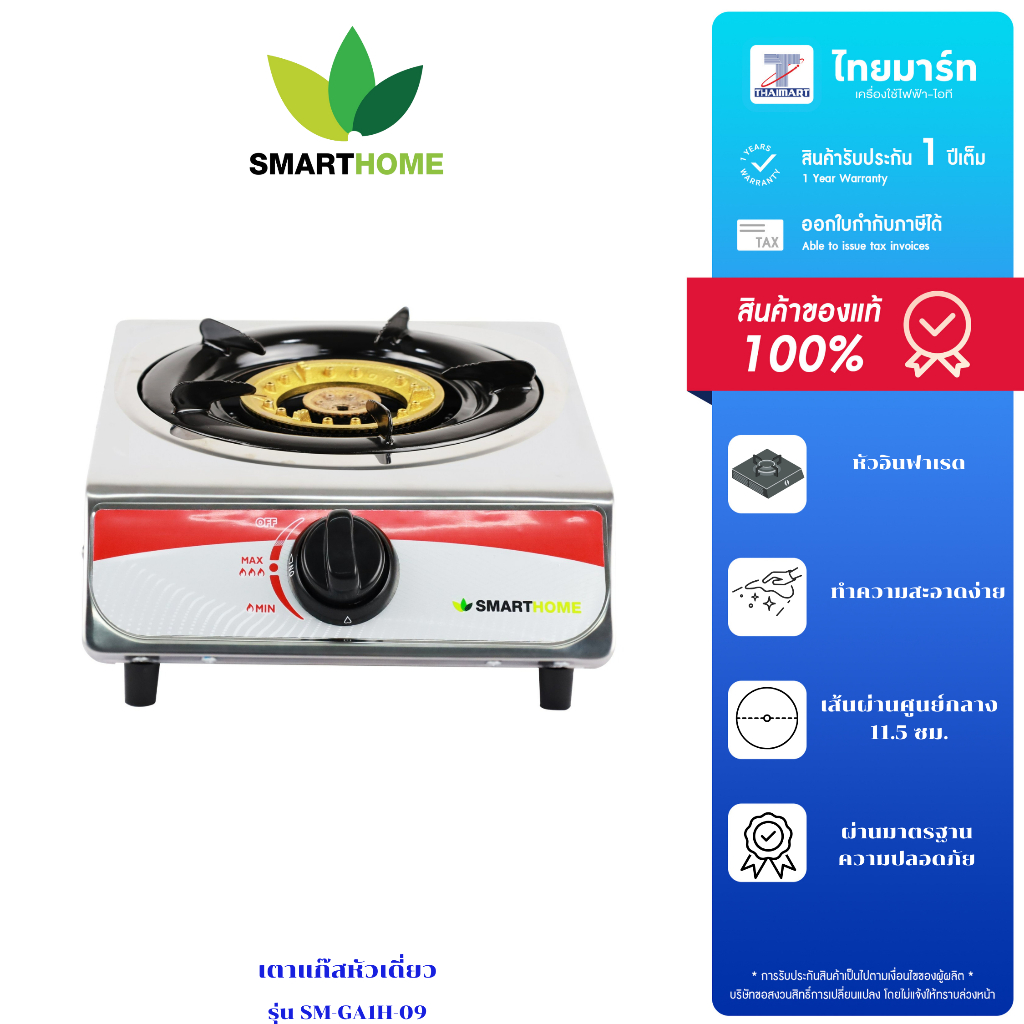 SMARTHOME เตาแก๊สสแตนเลส รุ่น SM-GA1H-09 การรับประกัน 1 ปี