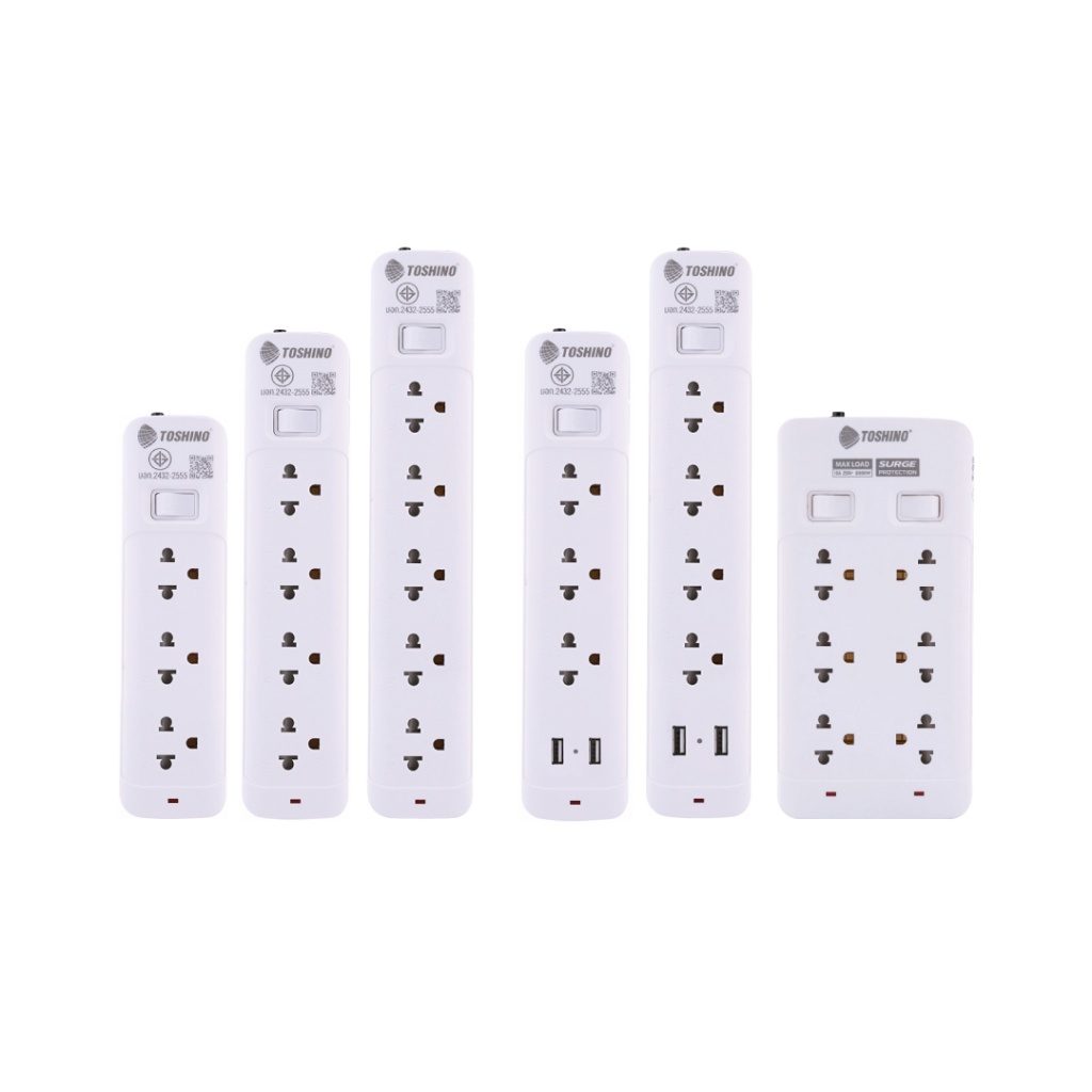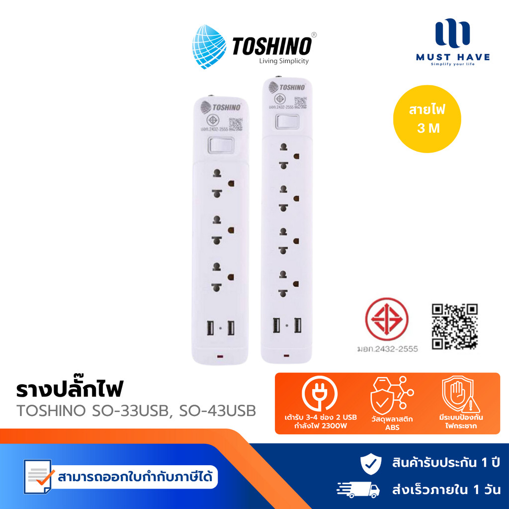 Toshino SO-33USB, SO-43USB - รางปลั๊ก 3-4 ช่อง + 2 USB สายยาว 3 ม. ระบบป้องกันไฟกระชาก มี ไฟแสดงสถานะการใช้งาน