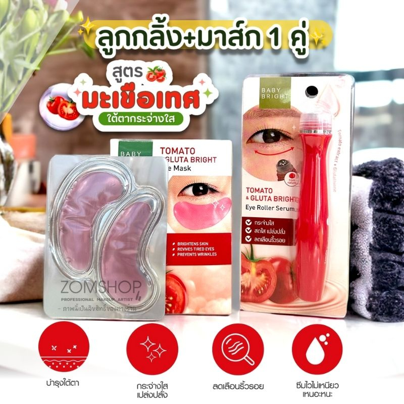 Set Tomato【ลูกกลิ้ง+มาส์ก1คู่】Baby Bright Tomato & Gluta Bright Eye Mask & Eye Roller Serum 15ml.