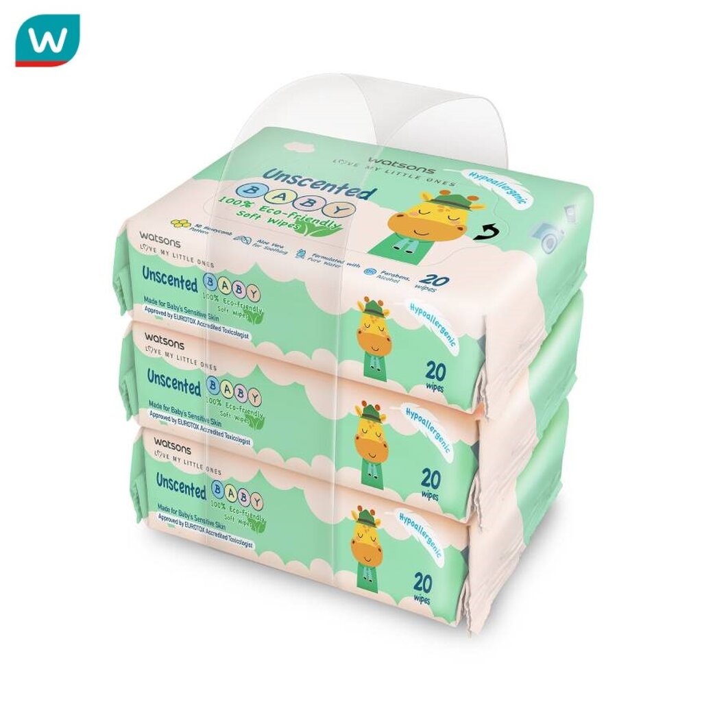 Watsons วัตสัน อันเซ้นต์เท็ด เบบี้ 100 อีโค่-เฟรนด์ลี่ ซอฟท์ ไวพ์ 20แผ่น x 3แพ็ค.