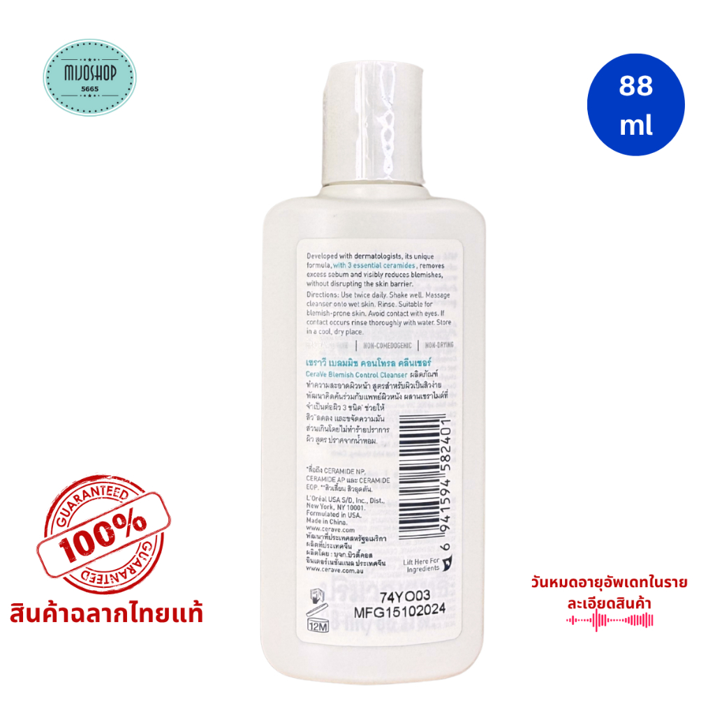 เซราวี CERAVE BLEMISH CONTROL CLEANSER เจลทำความสะอาดผิวหน้า สูตรสำหรับผิวเป็นสิวง่าย 88 มล.