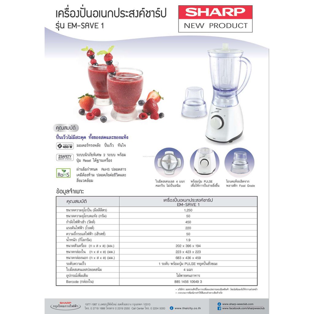 Sharp เครื่องปั่นอเนกประสงค์ ความจุ 1.25 ลิตร รุ่น EM-SAVE1 กำลังไฟ 500 วัตต์ ใบมีดสแตนเลส 4 แฉก รับประกันศูนย์ 1 ปี