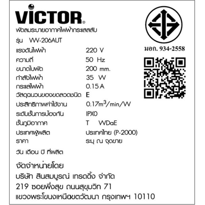 Victor พัดลม ระบายอากาศ 8 นิ้ว สำหรับติดปูน/ติดไม้ รุ่น VW-206AUT สีขาว รับประกันมอเตอร์ 3 ปี พัดลมดูดอากาศ วิคเตอร์