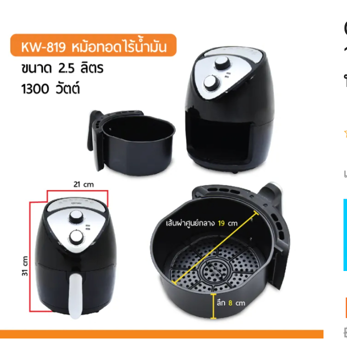 🔥 OXYGEN Air Fryer หม้อทอดไร้น้ำมัน รุ่น KW-819 ความจุ 2.5 ลิตร 1300W รับประกัน 1 ปี เก็บเงินปลายทาง