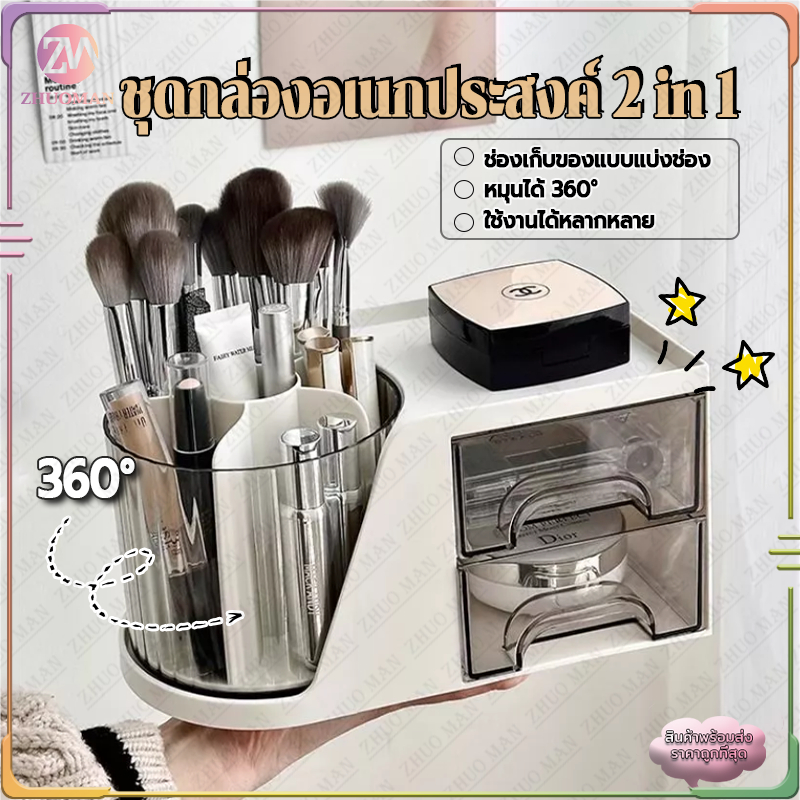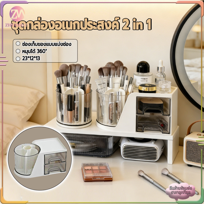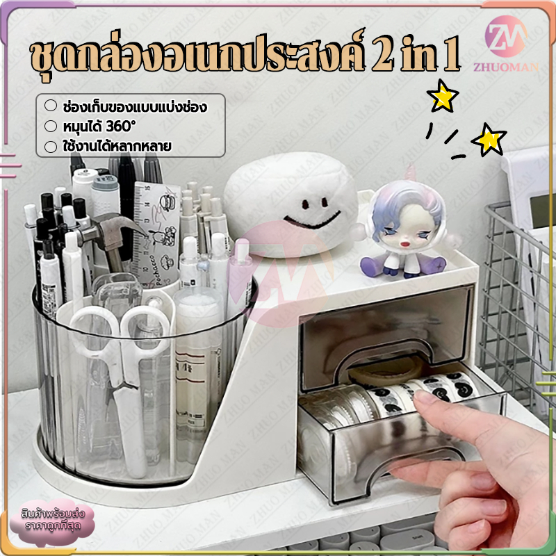 ชุดกล่องอเนกประสงค์ 2 in 1ที่ใส่เครื่องสำอาง หมุนได้ กล่องใส่เครื่อ 2 ชั้น สำอาง มีลิ้นชัก และ กล่องใส่เครื่องเขียน