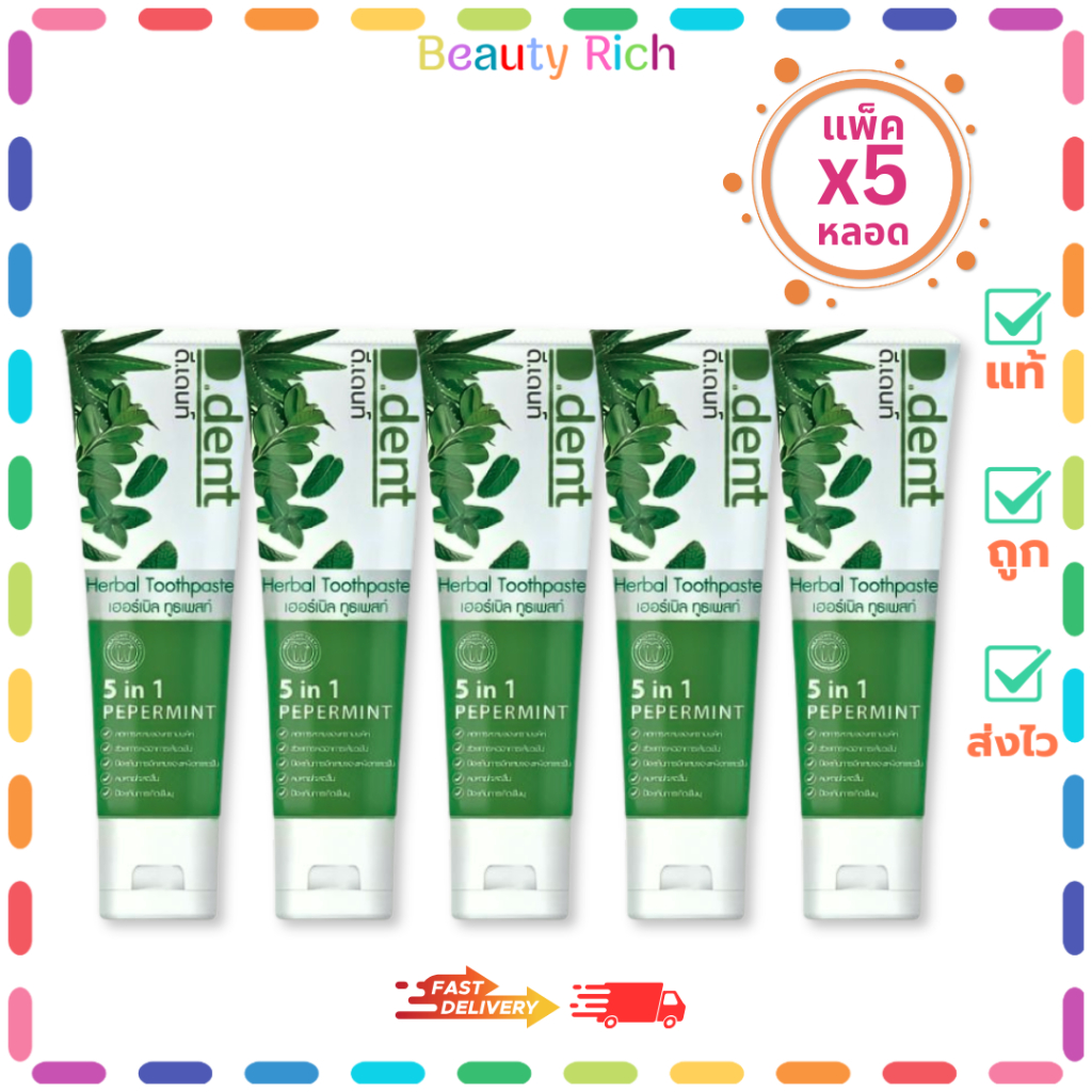 (แพ็ค 5 หลอด) D Dent 5in1 Peppermint ดีเดนท์ 5อิน1 เปเปอร์มิ้นท์ (100 g.)