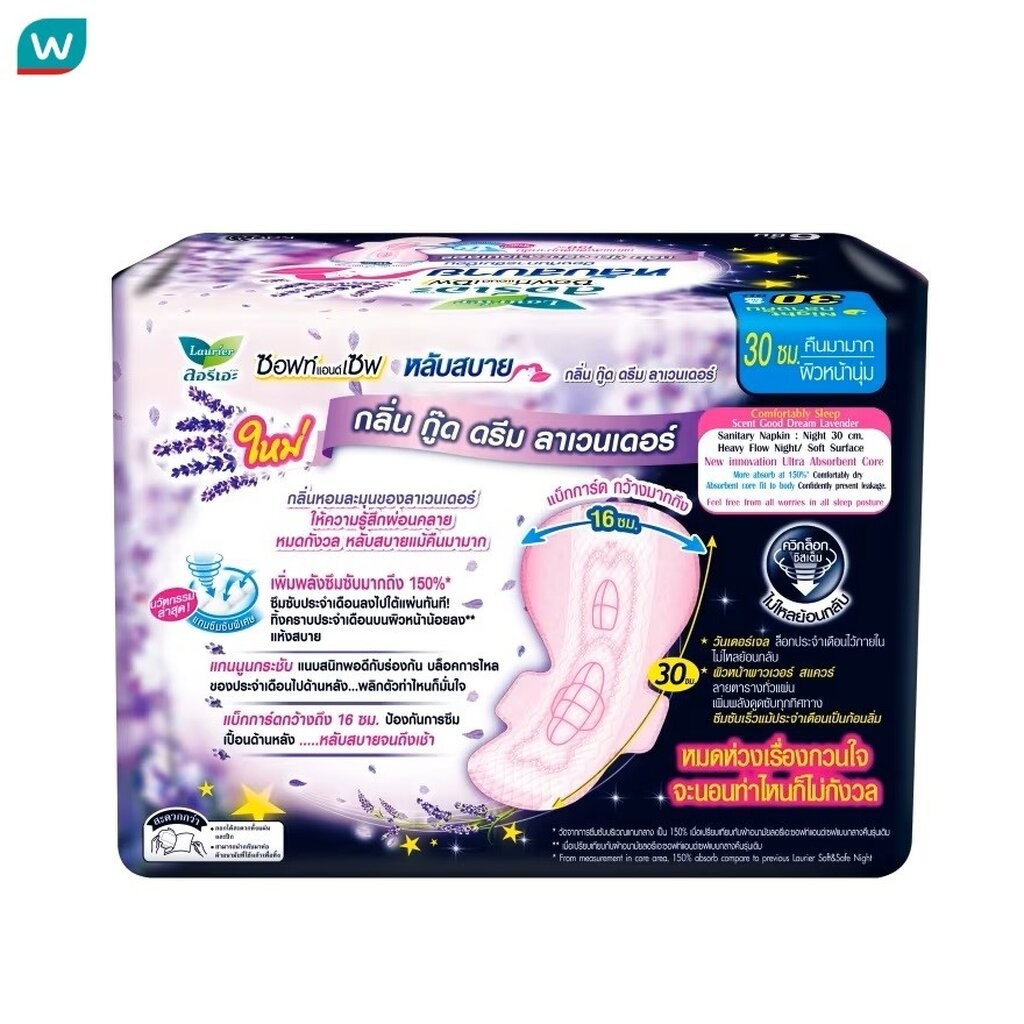 Laurier ลอรีเอะ ผ้าอนามัย ซอฟท์ แอนด์ เซฟ หลับสบาย กลิ่น กู๊ด ดรีม ลาเวนเดอร์ 30 ซม. 6 ชิ้น