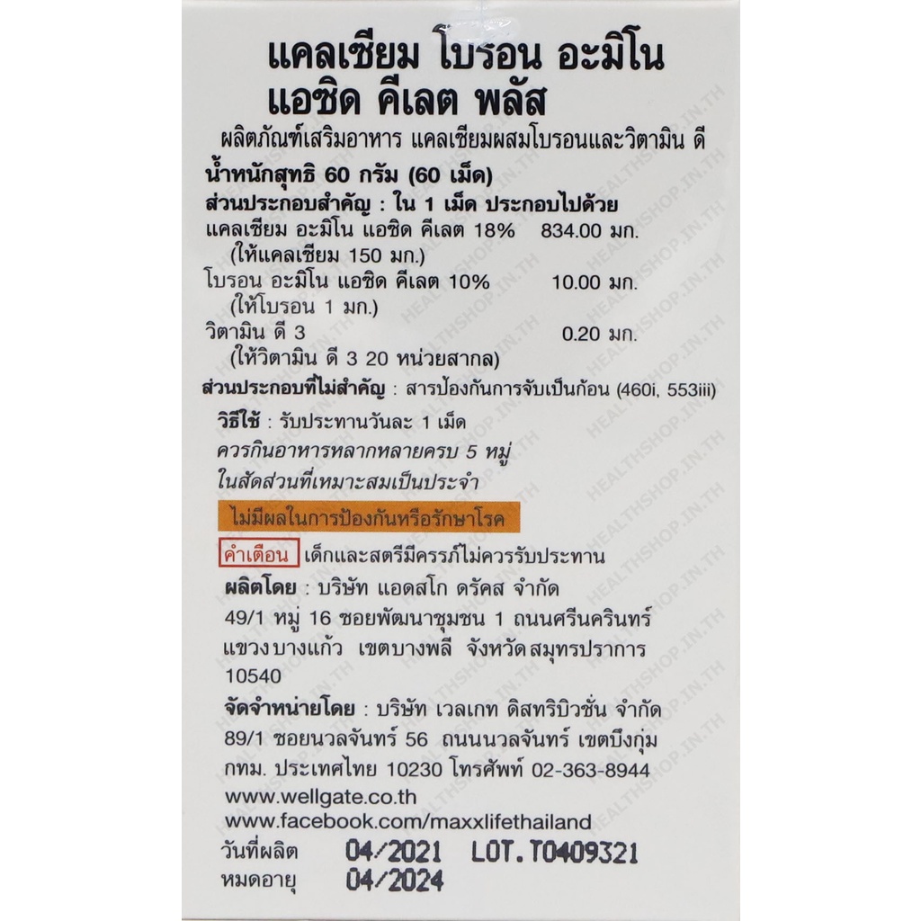 MAXXLIFE Calcium Boron Amino Acid Chelate Plus 60 Tablets ( แมกไลฟ์ แคลเซียม โบรอน Vitamin D3 )