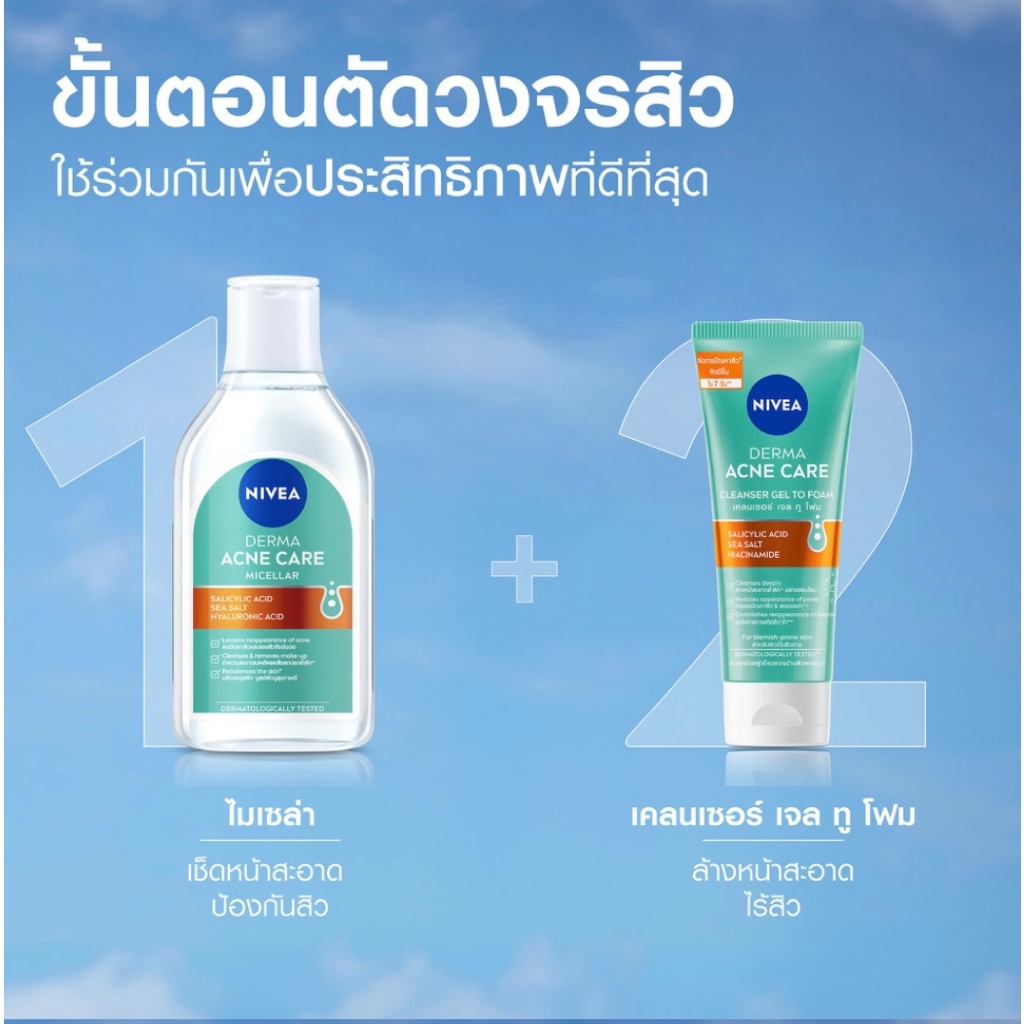 2 ชิ้น นีเวียคลีนซิ่ง 400 มล.โฟมล้างหน้า 90มล.Nivea dermal acne micellar cleansing 400ml.+ gel to foam cleanser 90 ml.