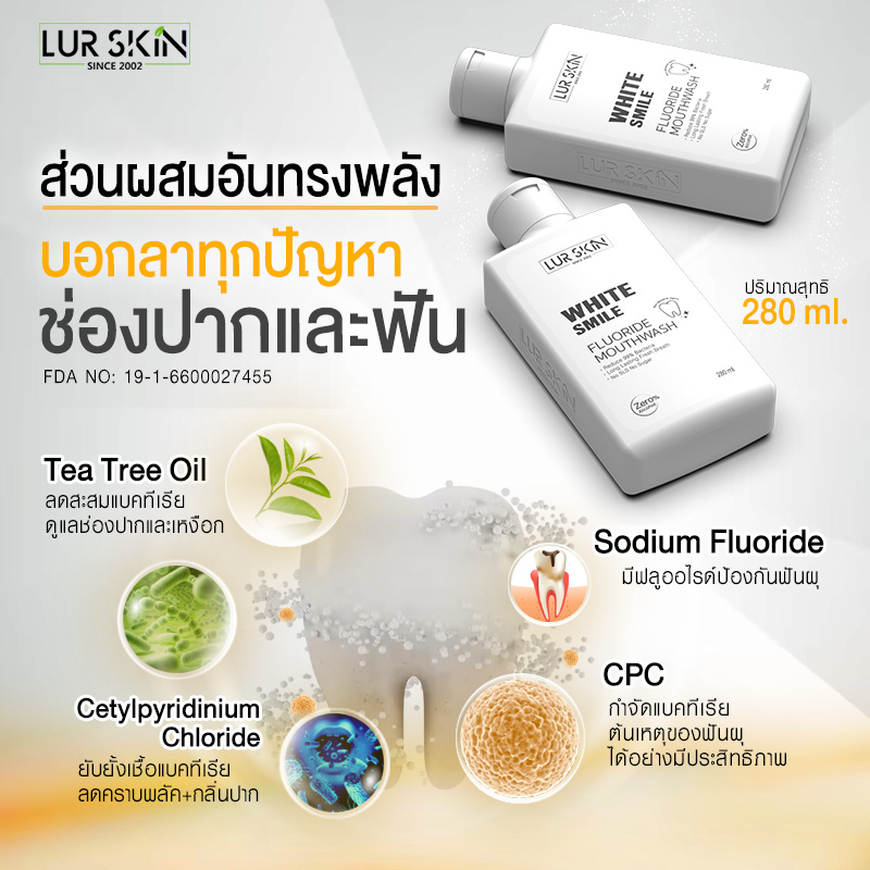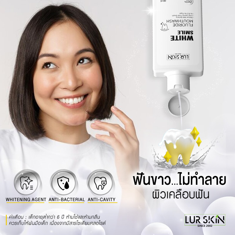 🚛ส่งฟรี ทั้งร้าน🔥 Lur Skin White Smile Fluoride Mouthwash 280ml น้ำยาป้วนปากของเลอสกิน จบทุกปัญหาช่องปากและฟัน