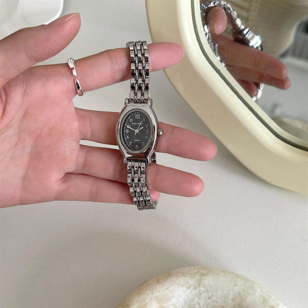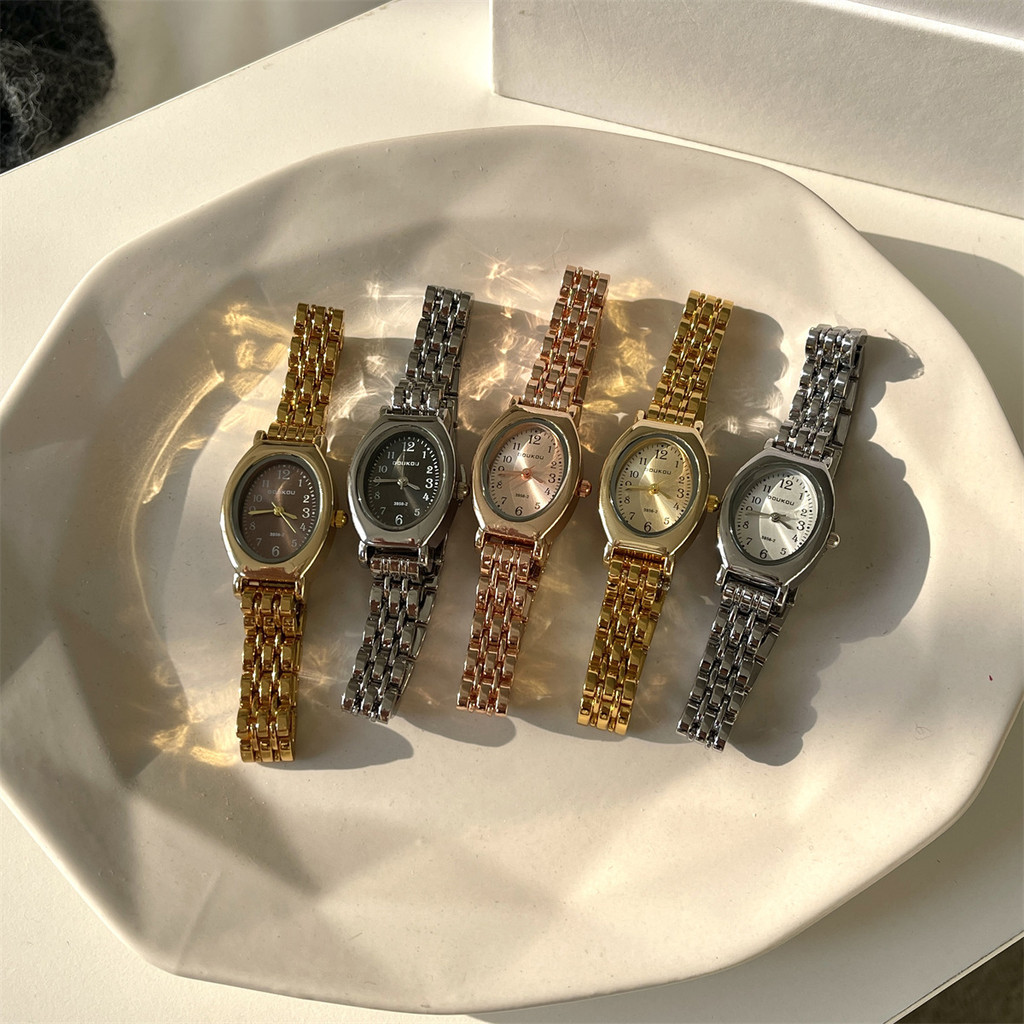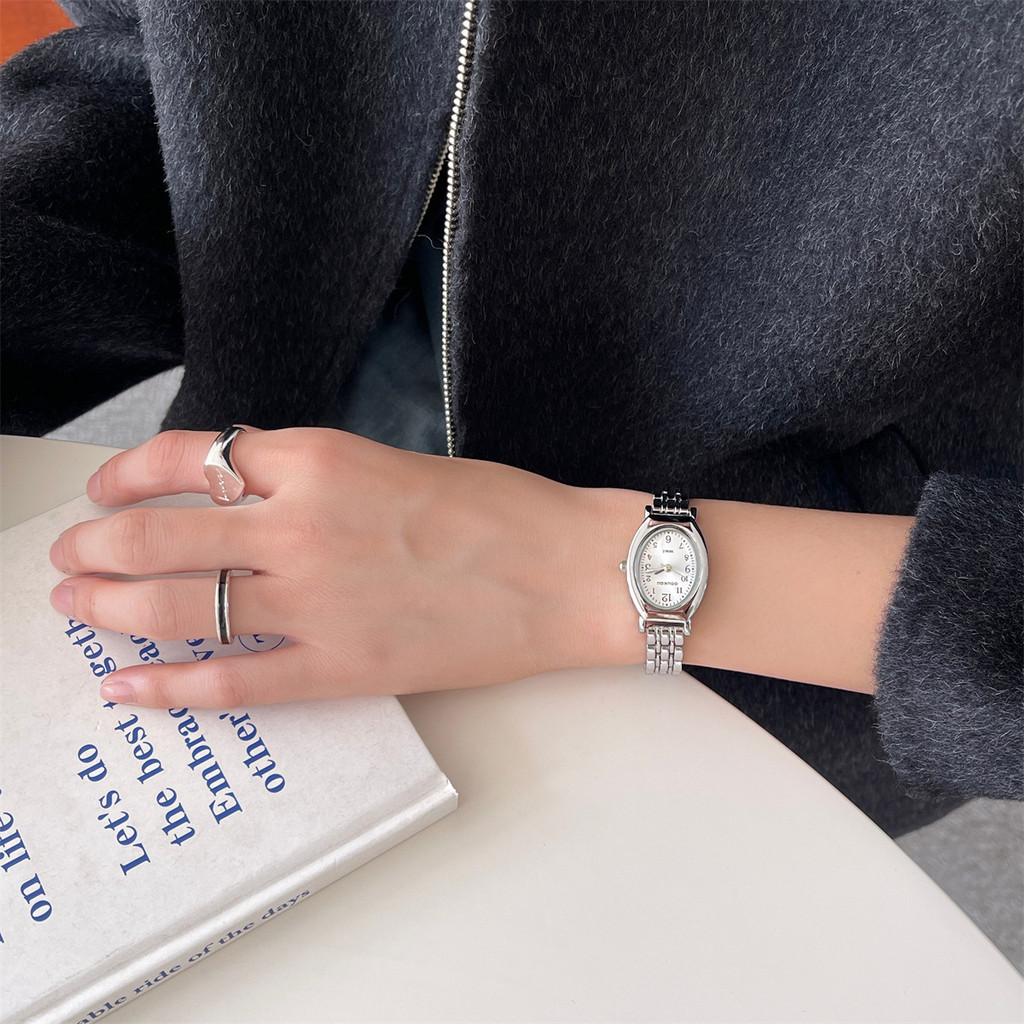 นาฬิการูปไข่สําหรับนักเรียนหญิงการออกแบบสไตล์โบราณสายเหล็กนาฬิกาควอทซ์เกาหลีประณีตและระดับไฮเอนด์