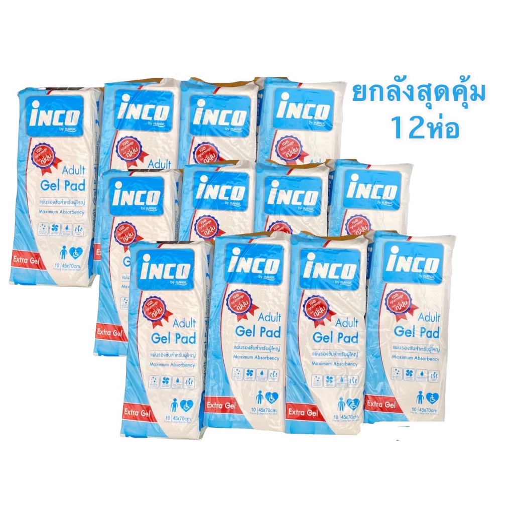 INCOอินโก้ ยกลังสุดคุ้ม **12ห่อ***แผ่นรองซับมีเจล สำหรับผู้ใหญ่ 10 แผ่น ต่อ แพ็ค (12 แพ็คต่อลัง)