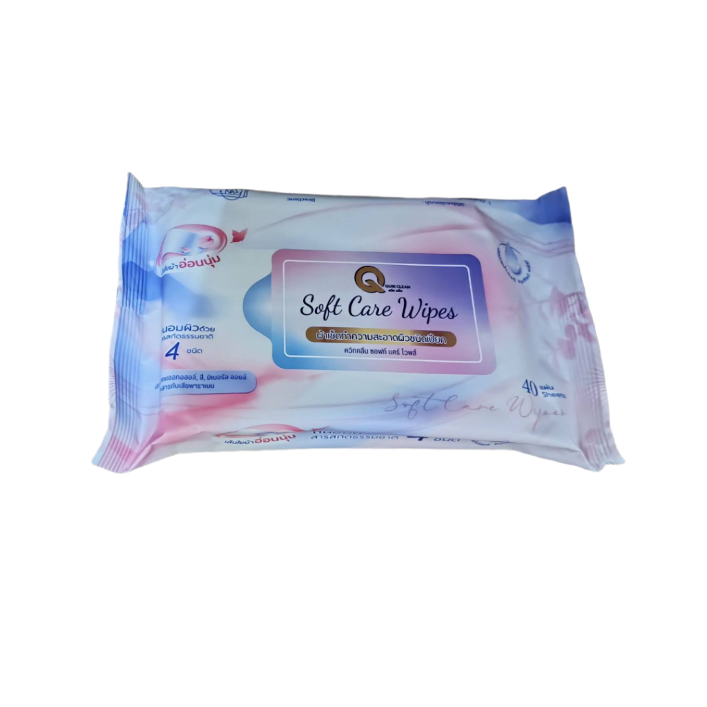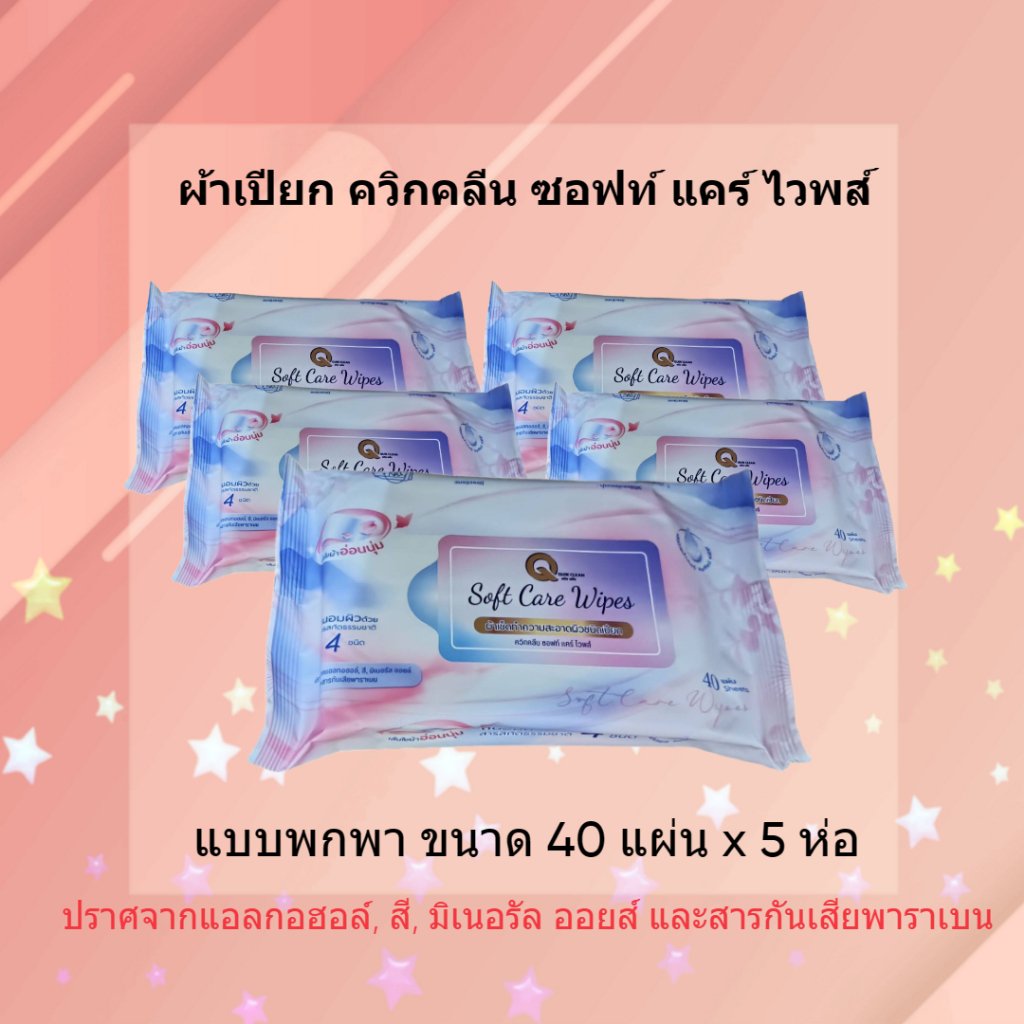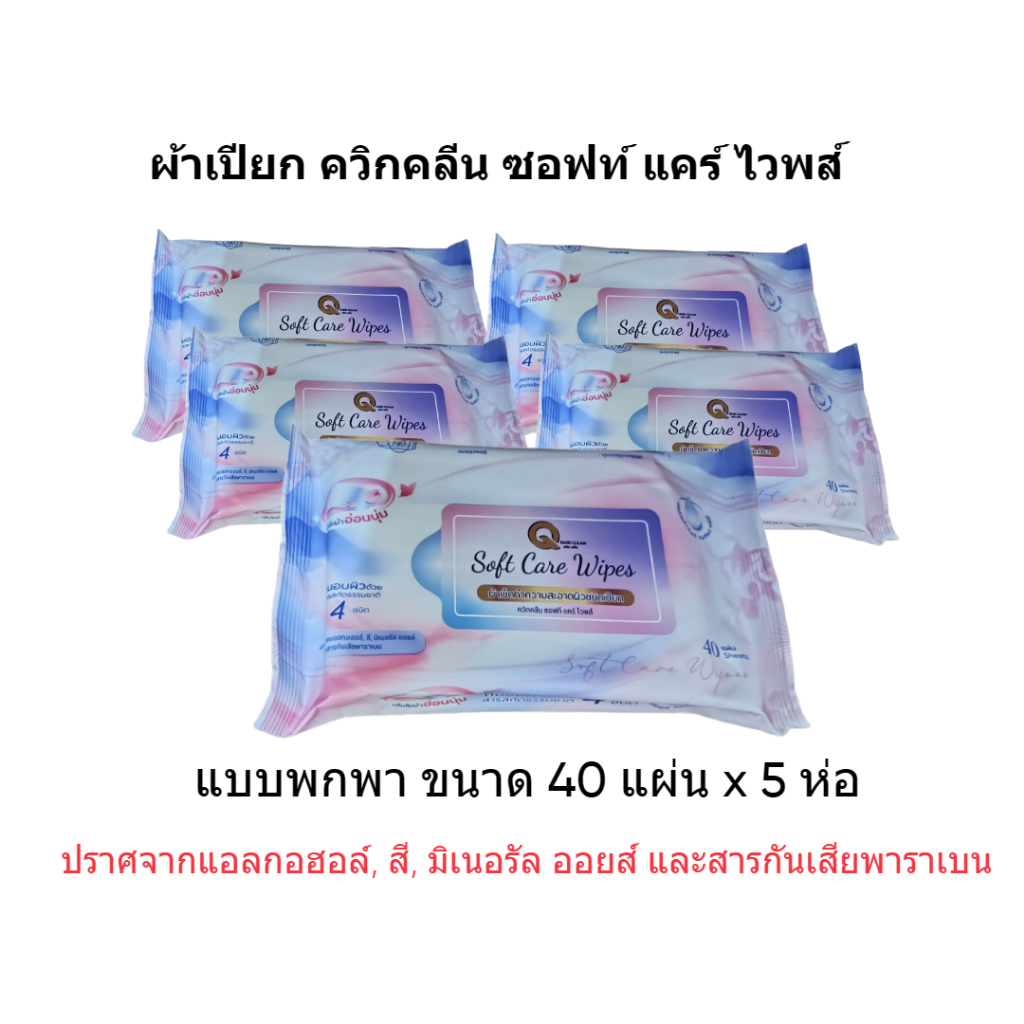 Quick Clean ผ้าเปียก ควิกคลีน ซอฟท์ แคร์ ไวพส์ แบบพกพา 40 แผ่น จำนวน 5 ห่อ