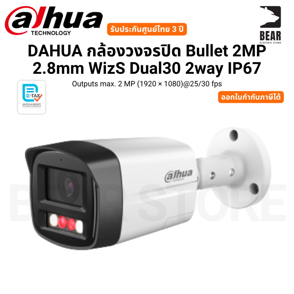 DAHUA กล้องวงจรปิด Bullet 2MP 2.8mm WizS Dual30 2way IP67 Outputs max. 2 MP (1920 × 1080)@25/30 fpsรับประกันศูนย์ไทย3ปี