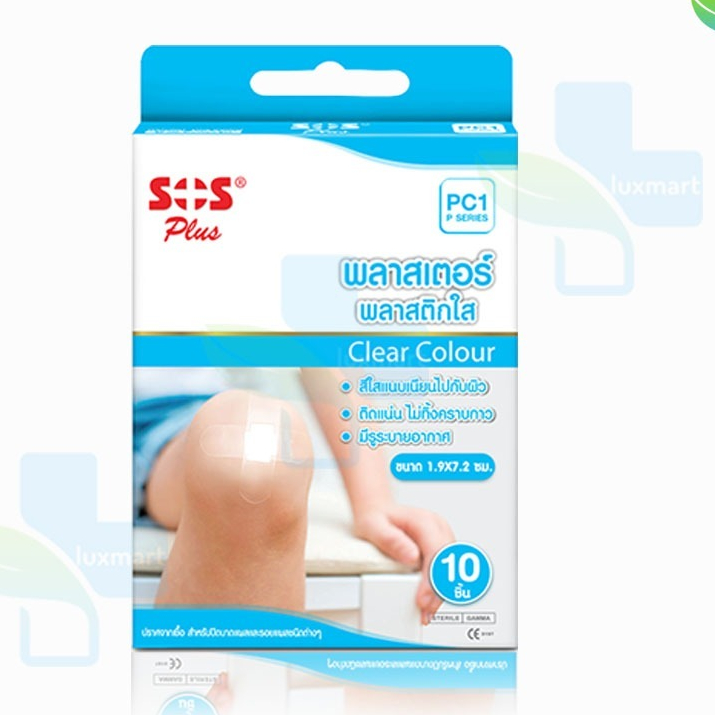 SOS Plus PC1 พลาสเตอร์พลาสติกใส ขนาด 1.97x7.2ซม. 10 ชิ้น [1 กล่อง สีฟ้า] พลาสเตอร์ ติดแน่น ไม่ทิ้งคราบกาว แบบพลาสติกใส