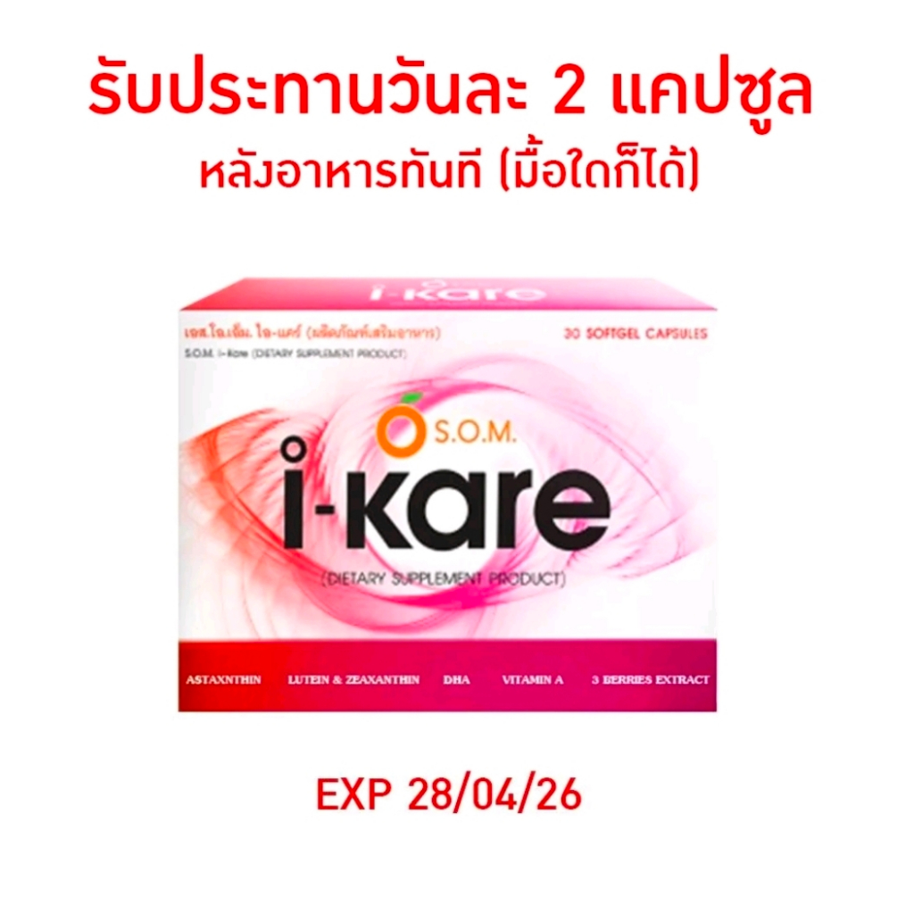 I-Kare ไอแคร์ (1 กล่อง 30 แคปซูล) " หมดอายุ 28/04/26 ทานวันละ 2 แคปซูล หลังอาหาร "