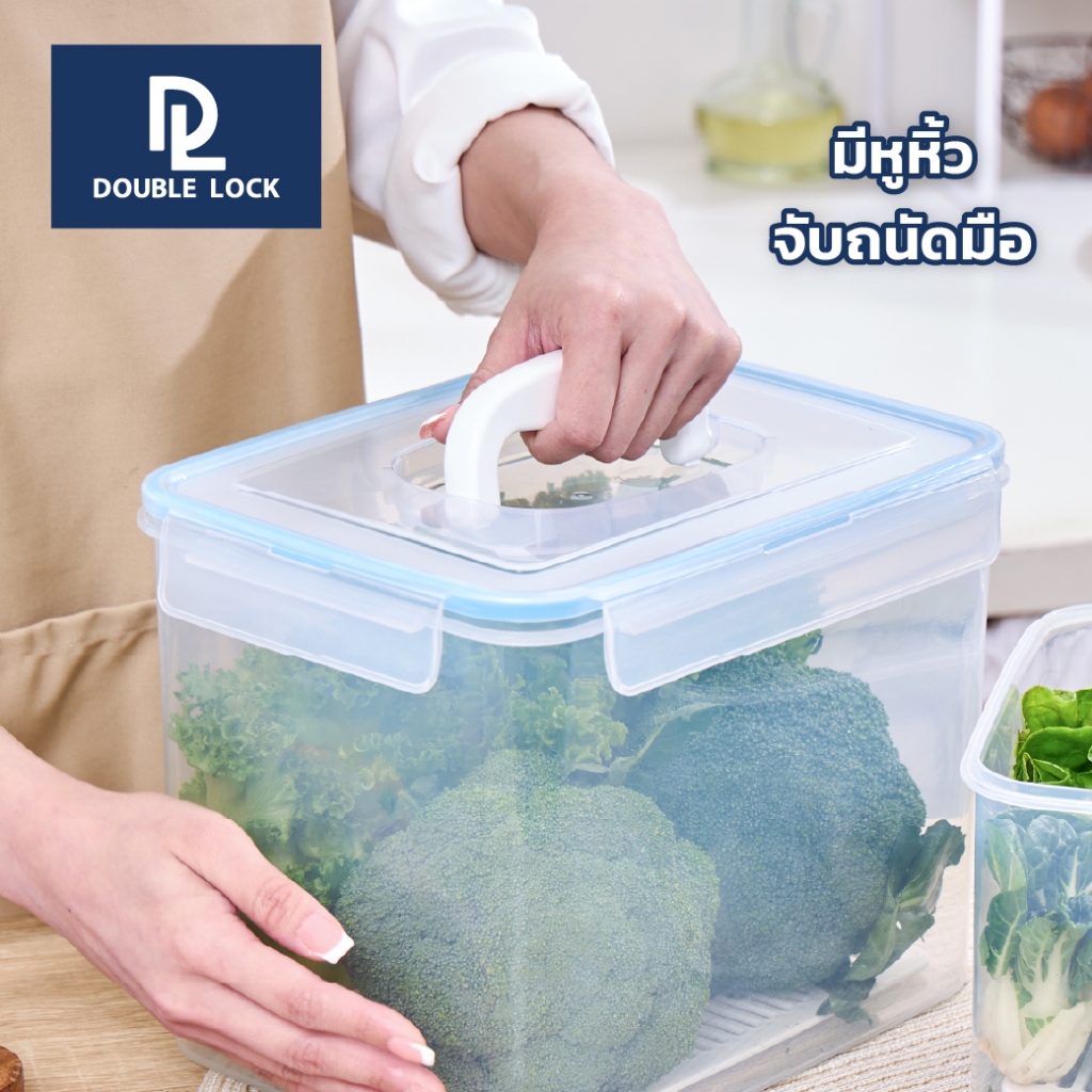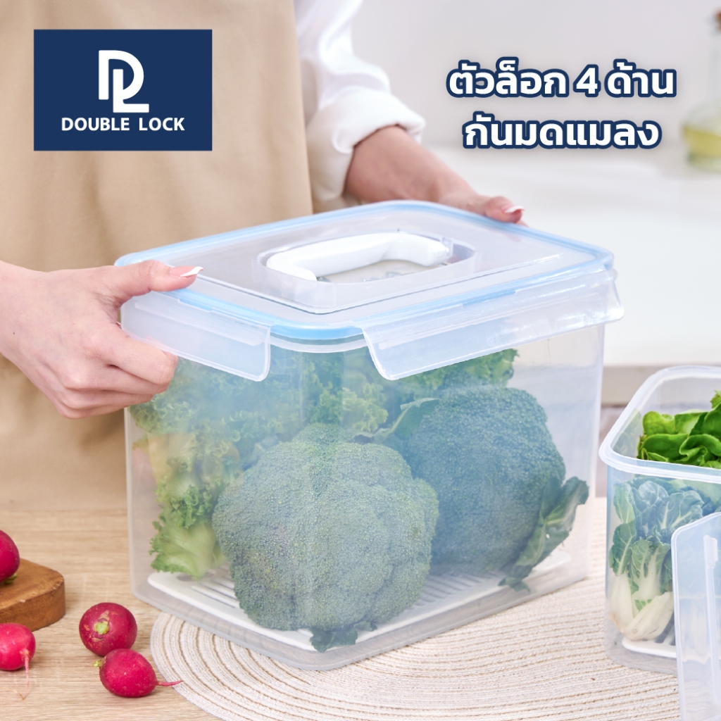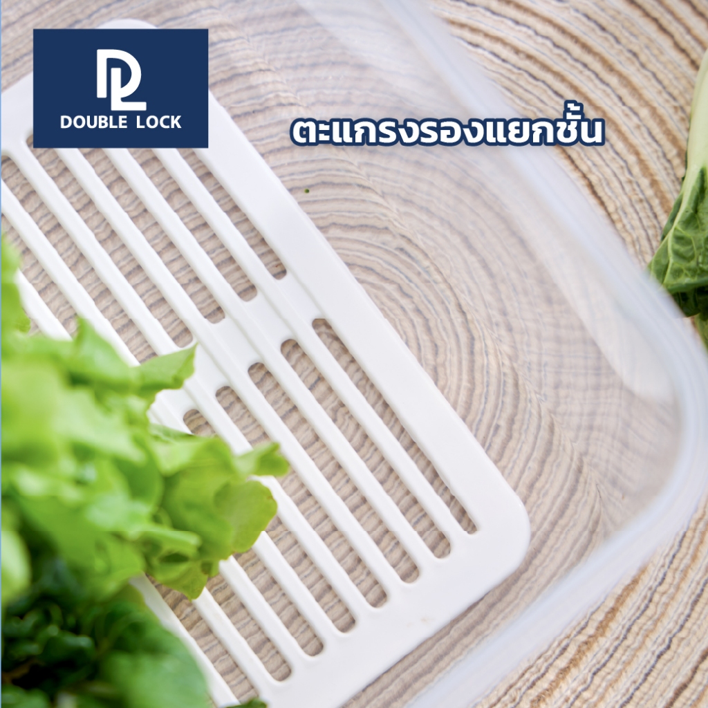 Double Lock กล่องอาหารเหลี่ยมหูหิ้ว พร้อมตะแกรง ใส่ผัก ผลไม้