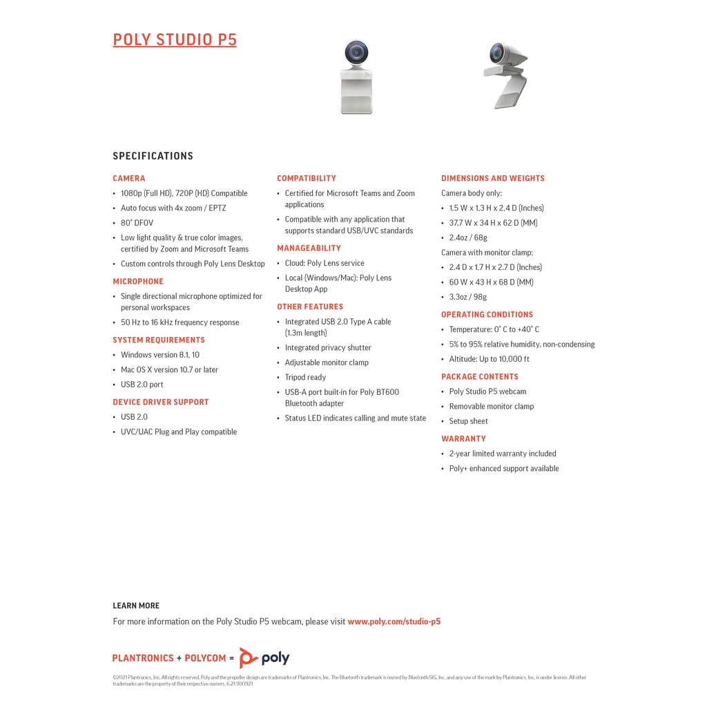 POLY STUDIO P5 WEBCAM 2MP USB กล้อง เว็บแคม มีไมโครโฟน ตัดเสียงรบกวน ประกันศูนย์