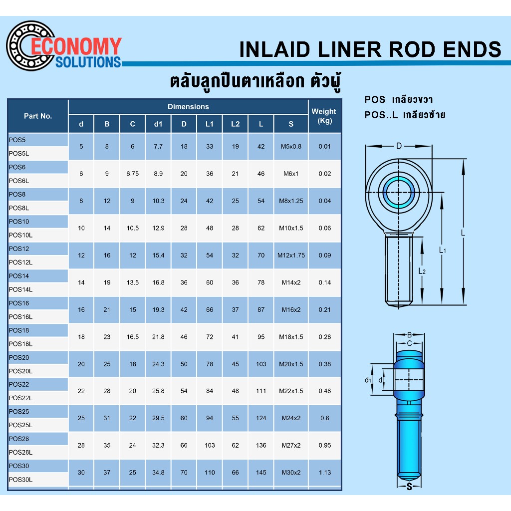 POS20 POS20L POS22 POS22L ตลับลูกปืนตาเหลือก ตัวผู้ เกลียวขวา / เกลียวซ้าย ( INLAID LINER ROD ENDS ) ลูกหมากคันชัก