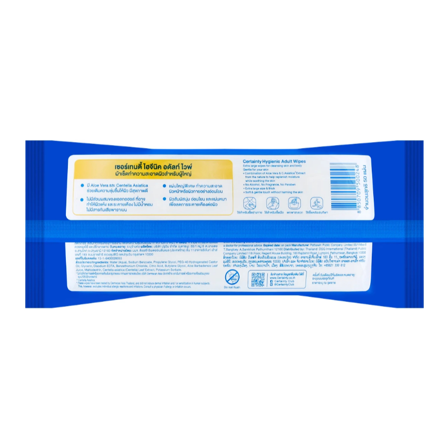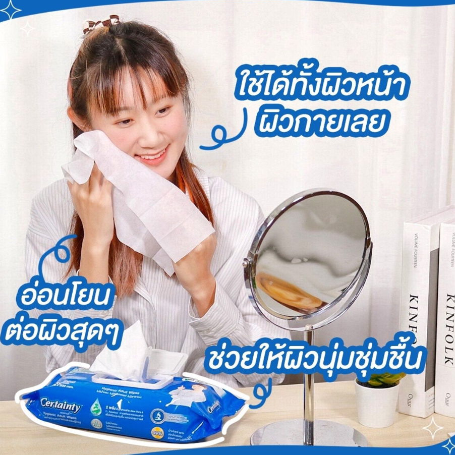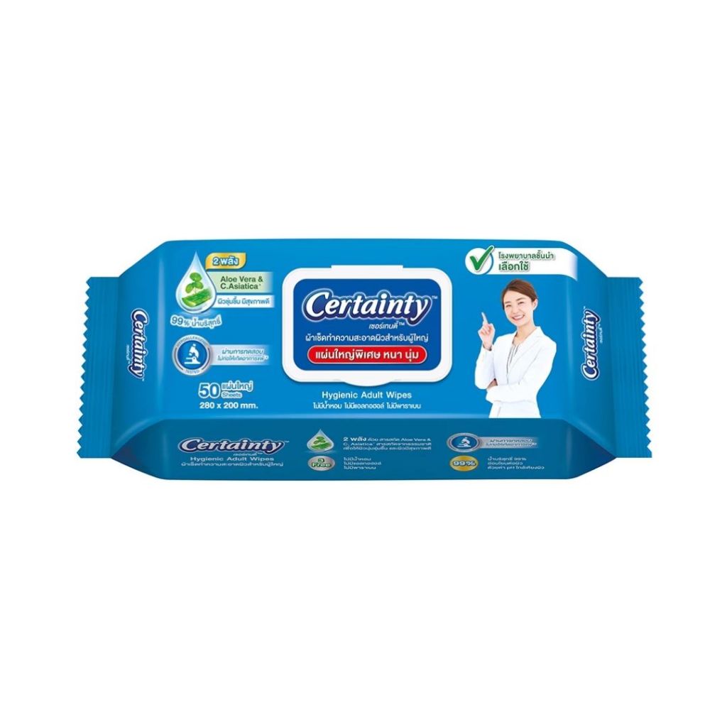 Certainty เซอร์เทนตี้ ผ้าเช็ดทำความสะอาดผิวสำหรับผู้ใหญ่ ทำความสะอาดเวลาเปลี่ยนผ้าอ้อม จำนวน 50 แผ่น