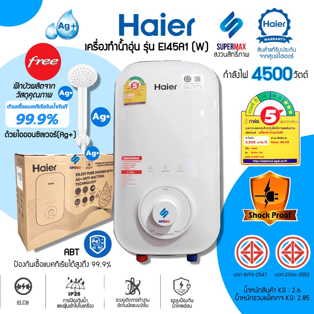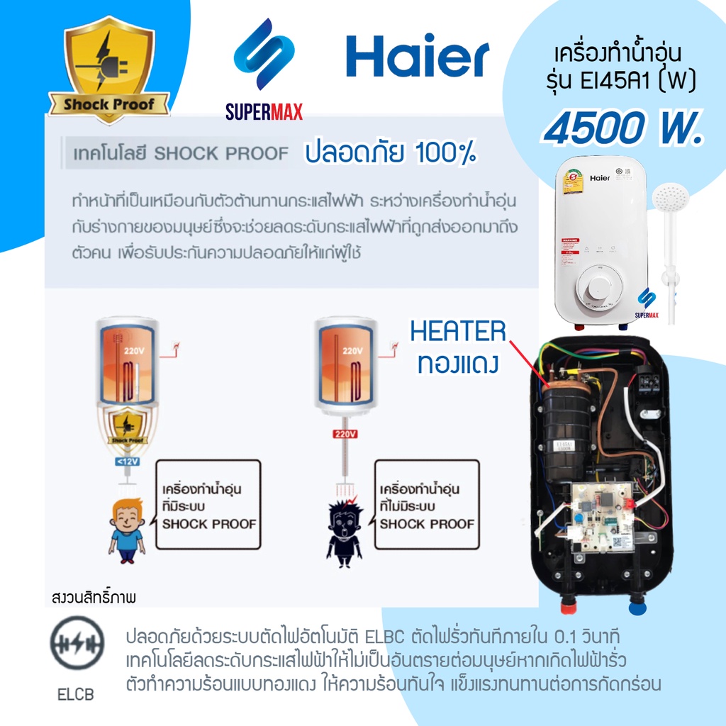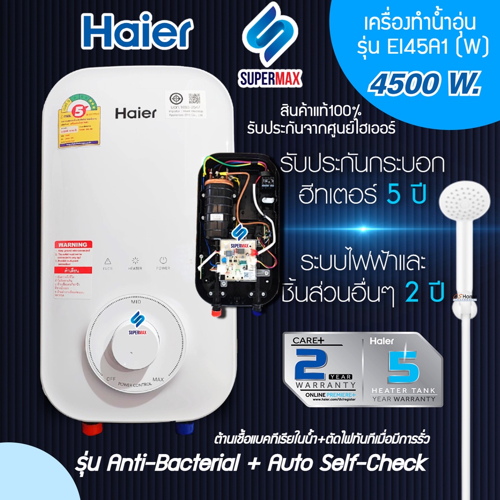 รุ่นใหม่Haier เครื่องทำน้ำอุ่น 4,500 วัตต์ รุ่น EI45A2W กำลังไฟ 4500W ระบบตัดไฟทันทีเมื่อมีไฟฟ้ารั่ว รับประกันสินค้า 2ปี