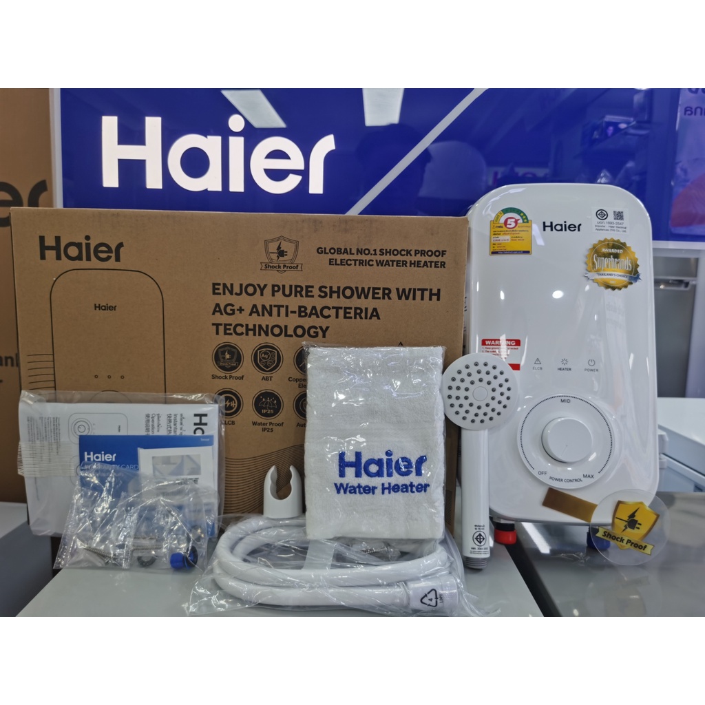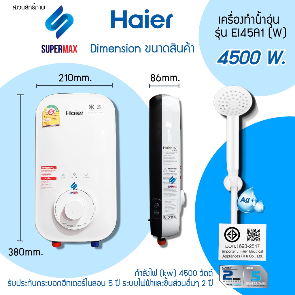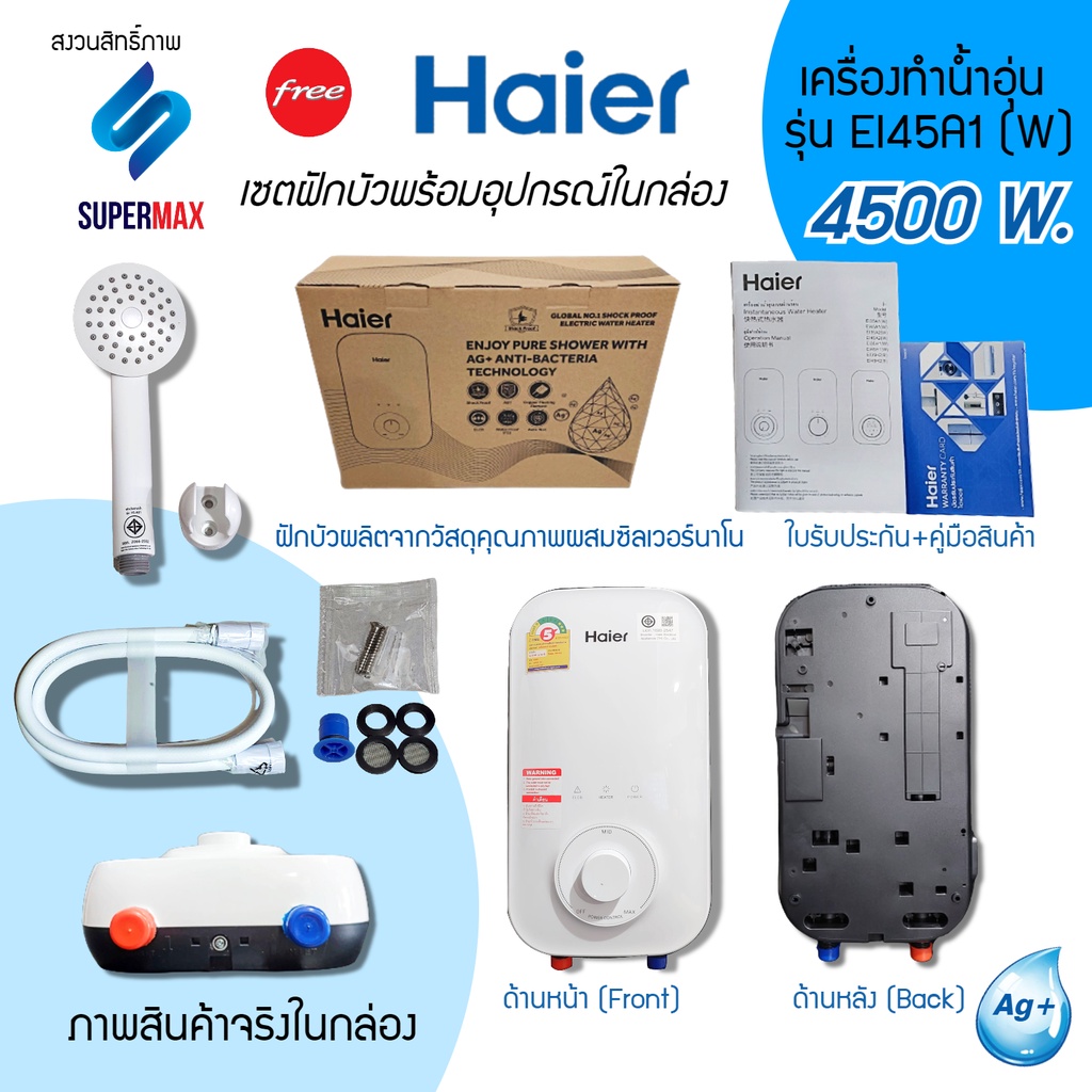 รุ่นใหม่Haier เครื่องทำน้ำอุ่น 4,500 วัตต์ รุ่น EI45A2W กำลังไฟ 4500W ระบบตัดไฟทันทีเมื่อมีไฟฟ้ารั่ว รับประกันสินค้า 2ปี