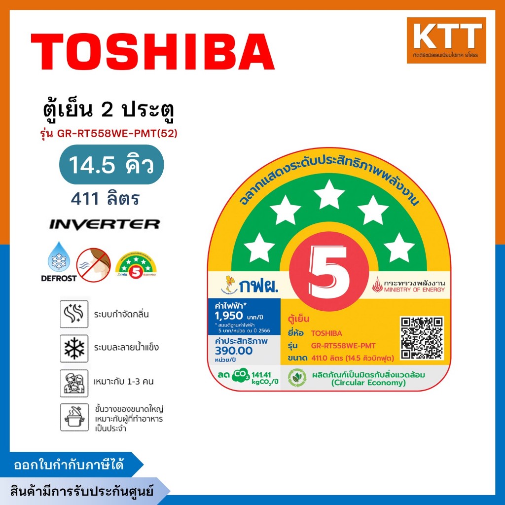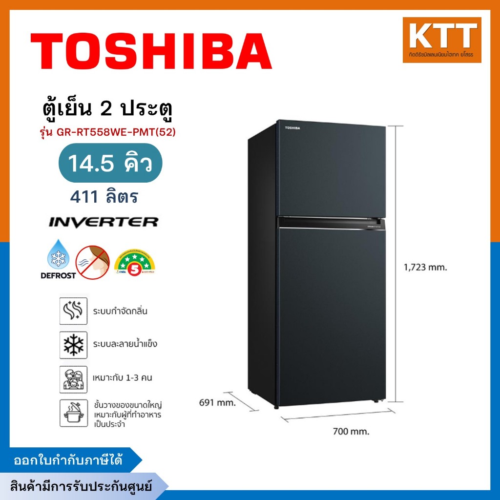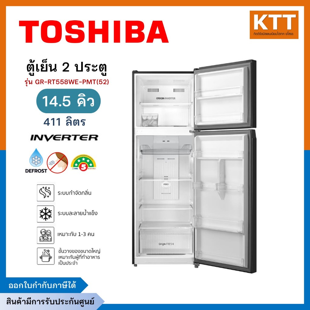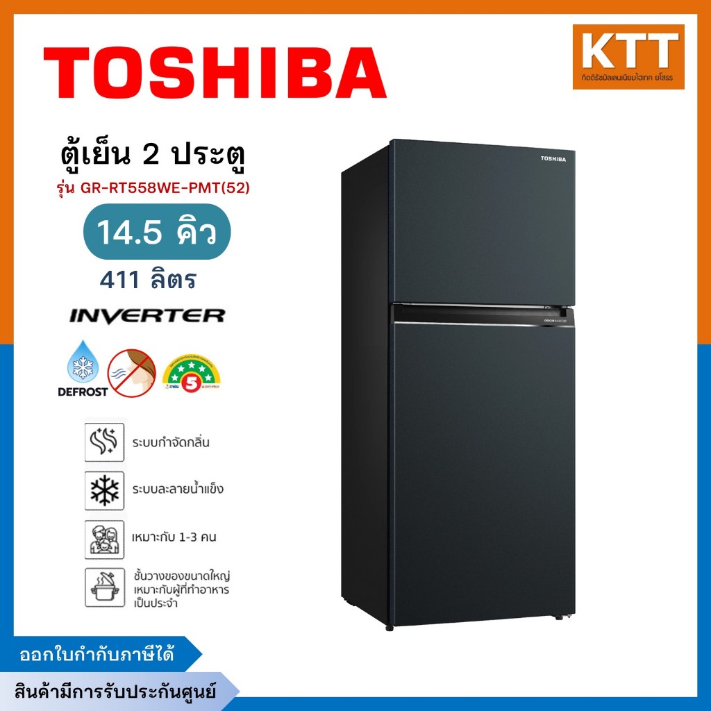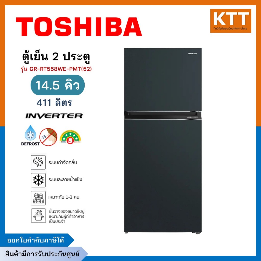 TOSHIBA ตู้เย็น 2 ประตู ขนาด 14.5Q INVERTER สีเทาดำ รุ่น GR-RT558WE-PMT(52)