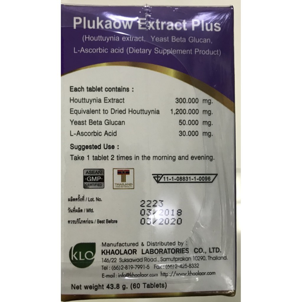 ขาวละออ พลูคาวสกัด Khaolaor Plukaow Extract Plus 60 เม็ด ผสมเบต้ากลูแคนและวิตามินซี #4868