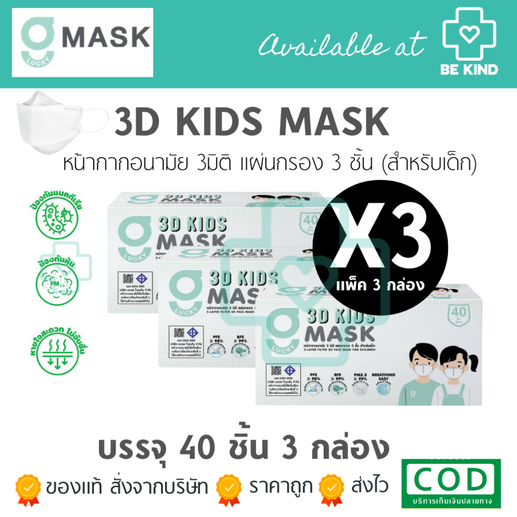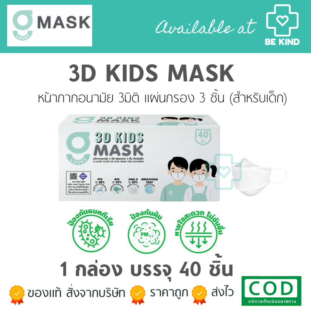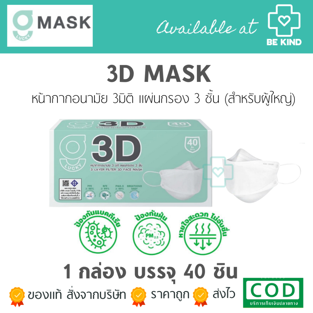 หน้ากากอนามัย 3 มิติ สีขาว G LUCKY 3D แมส 3D แบบกล่อง 40 ชิ้น หายใจสะดวก แมสหนา 3 ชั้น