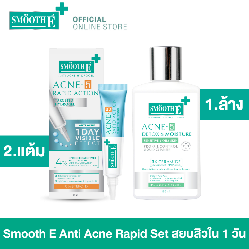 Smooth E Anti Acne Rapid Set สำหรับผิวมัน ผิวเป็นสิวง่าย จบสิวใน 1 วัน ลดรอยดำ รอยแดง สิวอักเสบอุดตัน ปราศจากสเตียรอยด์