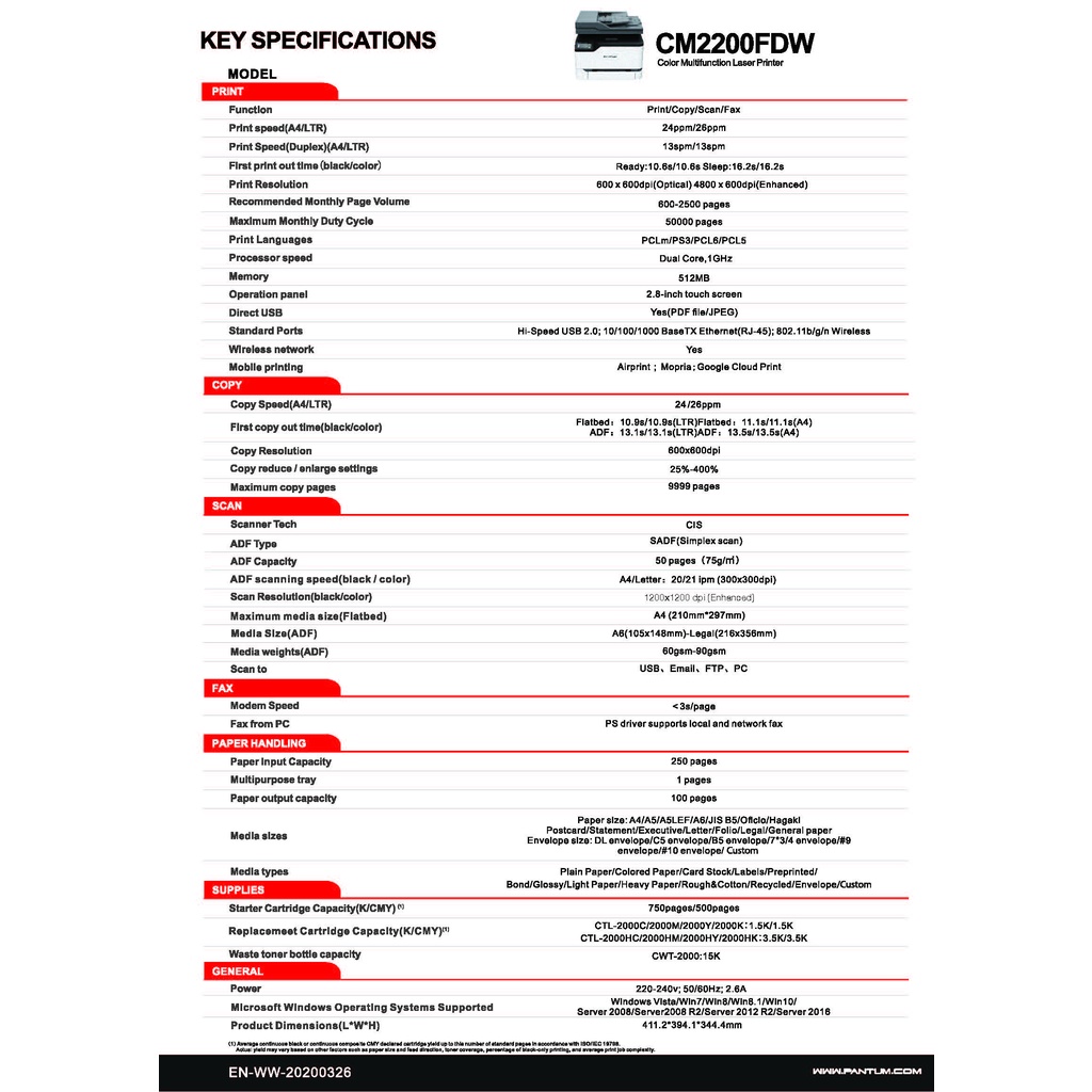 Pantum Color Laser MFP CM2200FDW Printer 3Yrs onsite