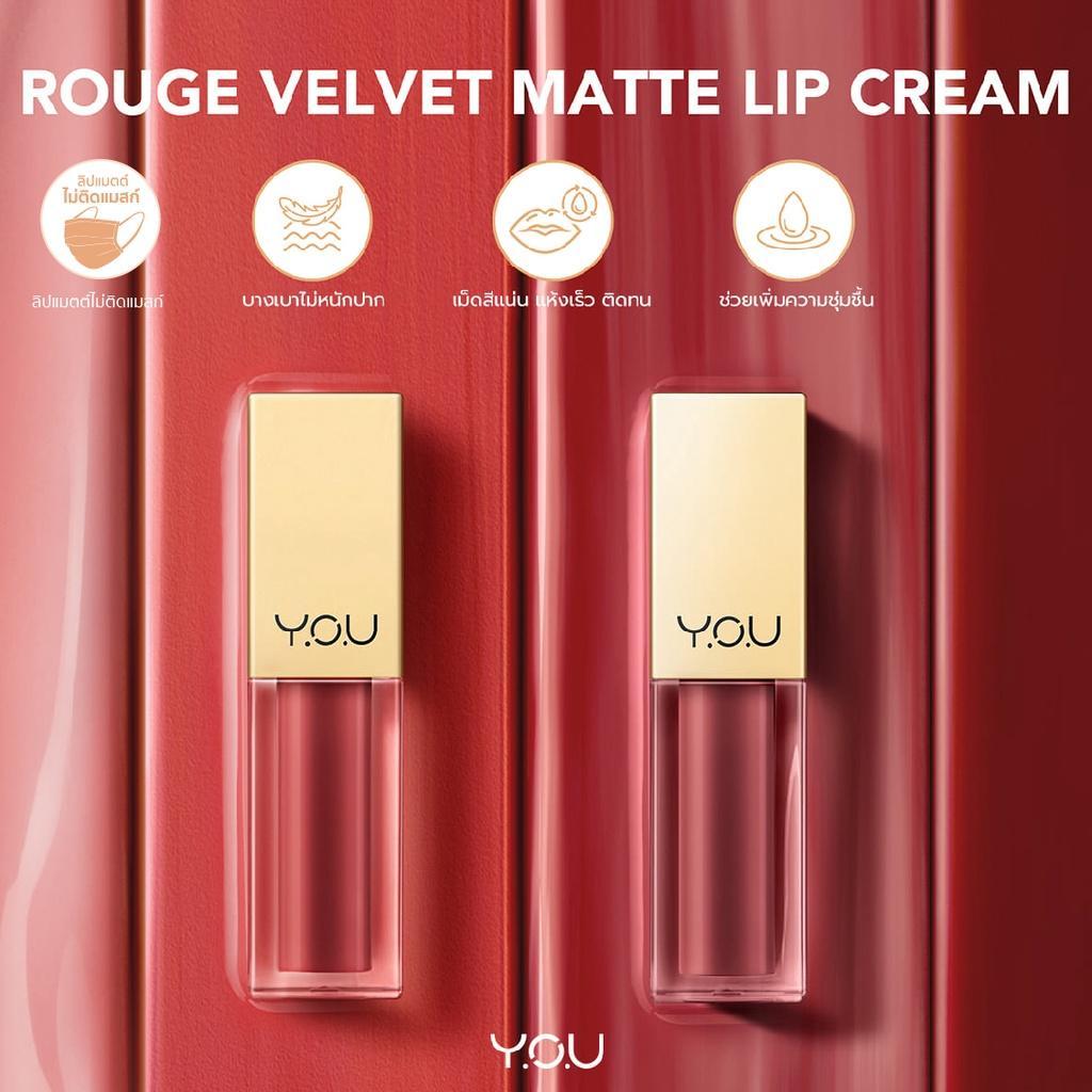 YOU Rouge Velvet Matte Lip Cream 4.5g วายโอยู รูจ เวลเวท แมท ลิป ครีม เนื้อเนียน บางเบา ไม่เลอะขอบแก้ว ริมฝีปาก