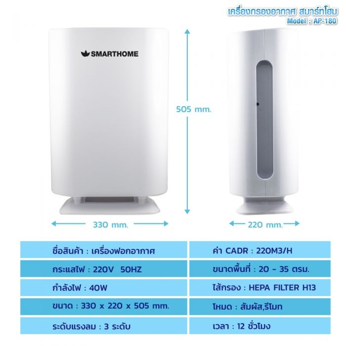 SMARTHOME เครื่องฟอกอากาศ 35 ตารางเมตร รุ่น AP180 | ไทยมาร์ท THAIMART