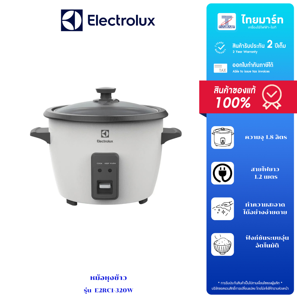 ELECTROLUX หม้อหุงข้าวฝาแก้ว E2RC1-320W ขนาด 1.8 ลิตร รับประกัน 2 ปี