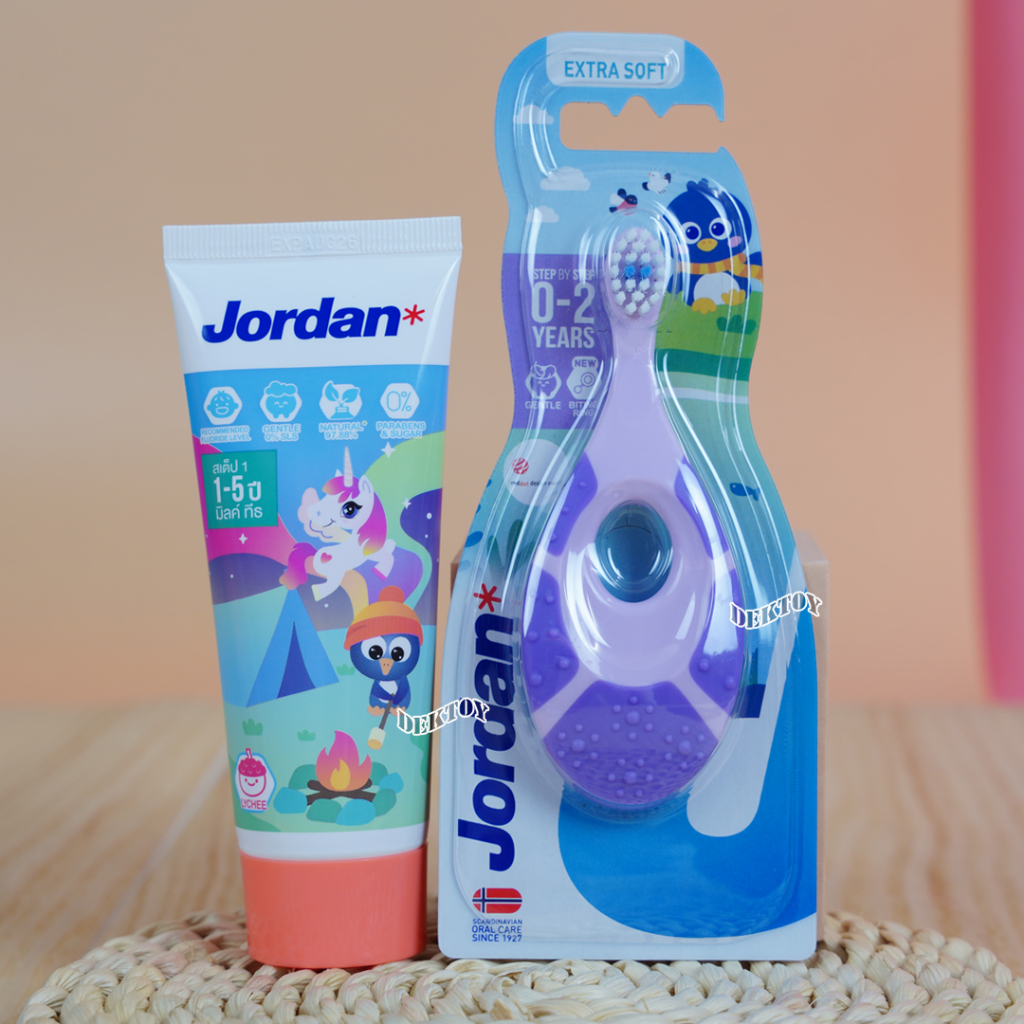Jordan จอร์แดน แปรงสีฟันเด็ก จอร์แดน1ชิ้น สเต็ป1 (0-2 ปี) + ยาสีฟันเด็กจอร์แดนสำหรับเด็ก 1-5 ปี