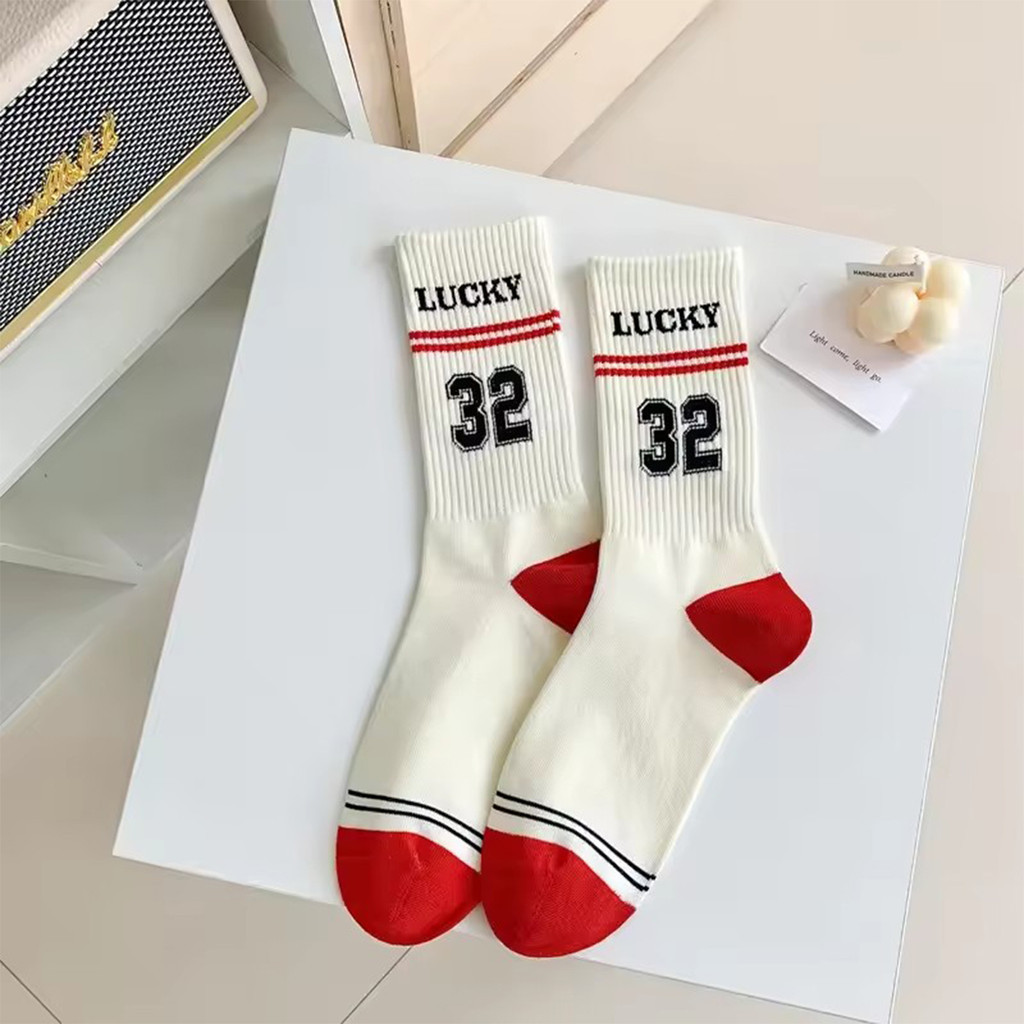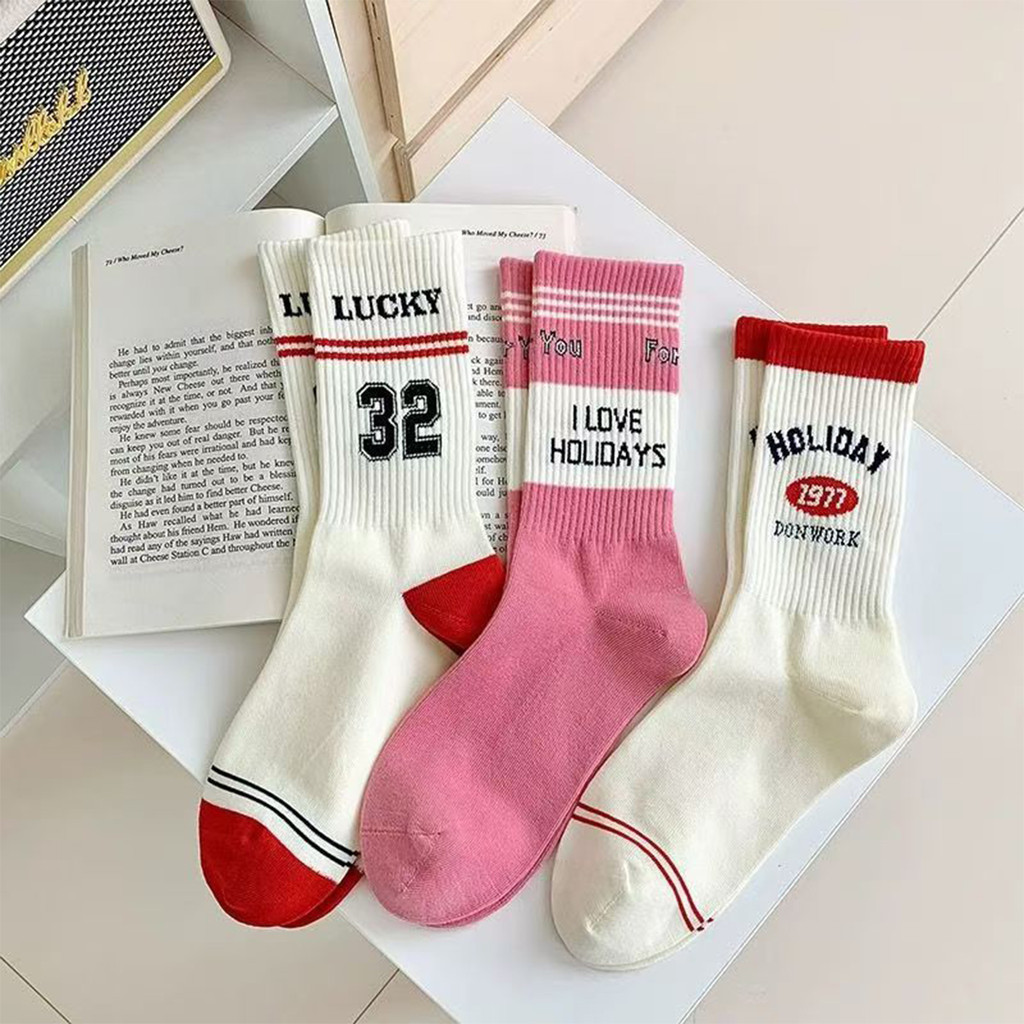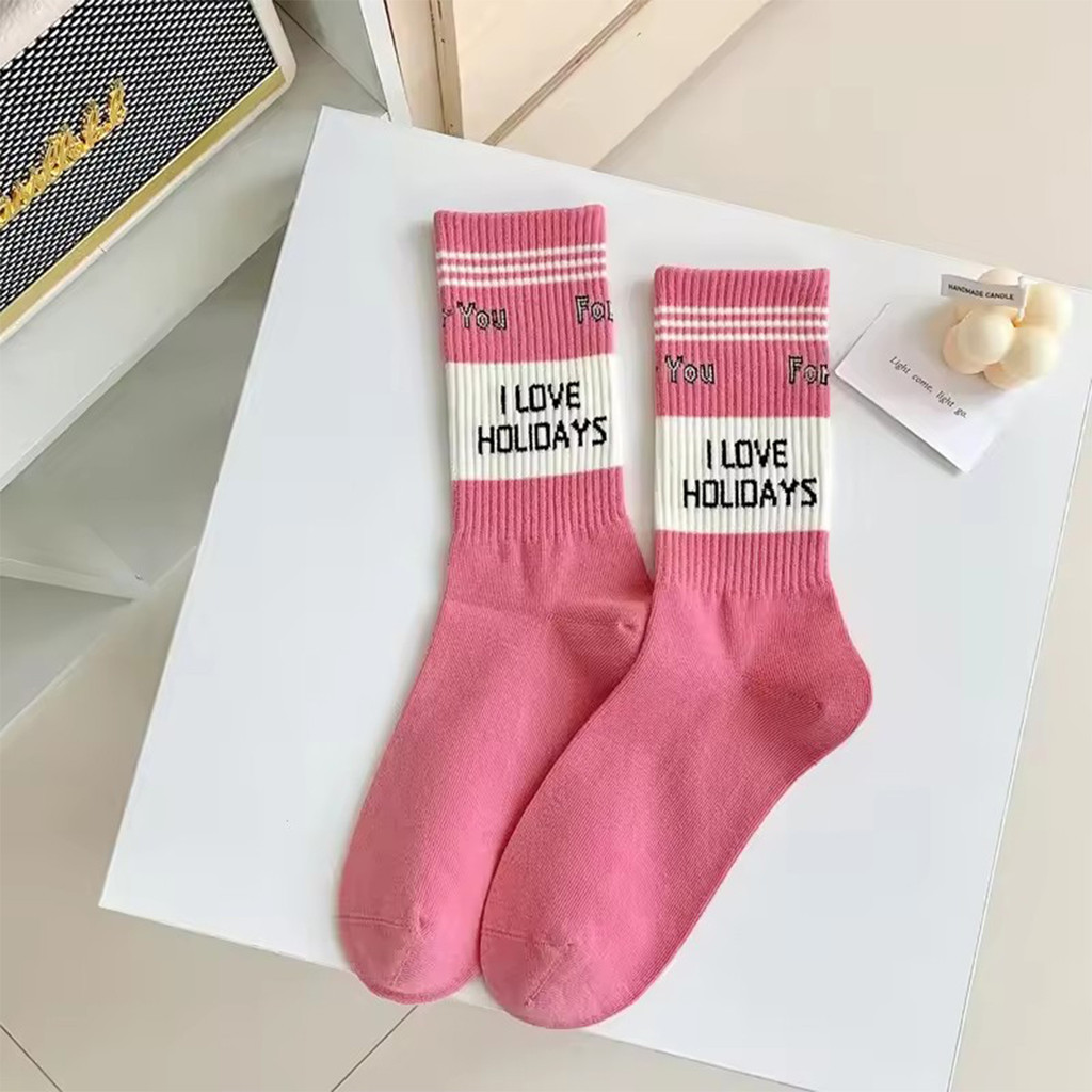 ตัวอักษรสีชมพูสาวกลางหลอดถุงเท้าสูงอินเทรนด์ถนนสวมใส่กีฬาสไตล์ญี่ปุ่นผู้หญิงถุงเท้าผู้หญิงถุงเท้า