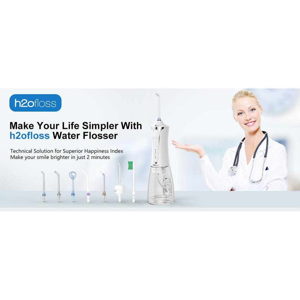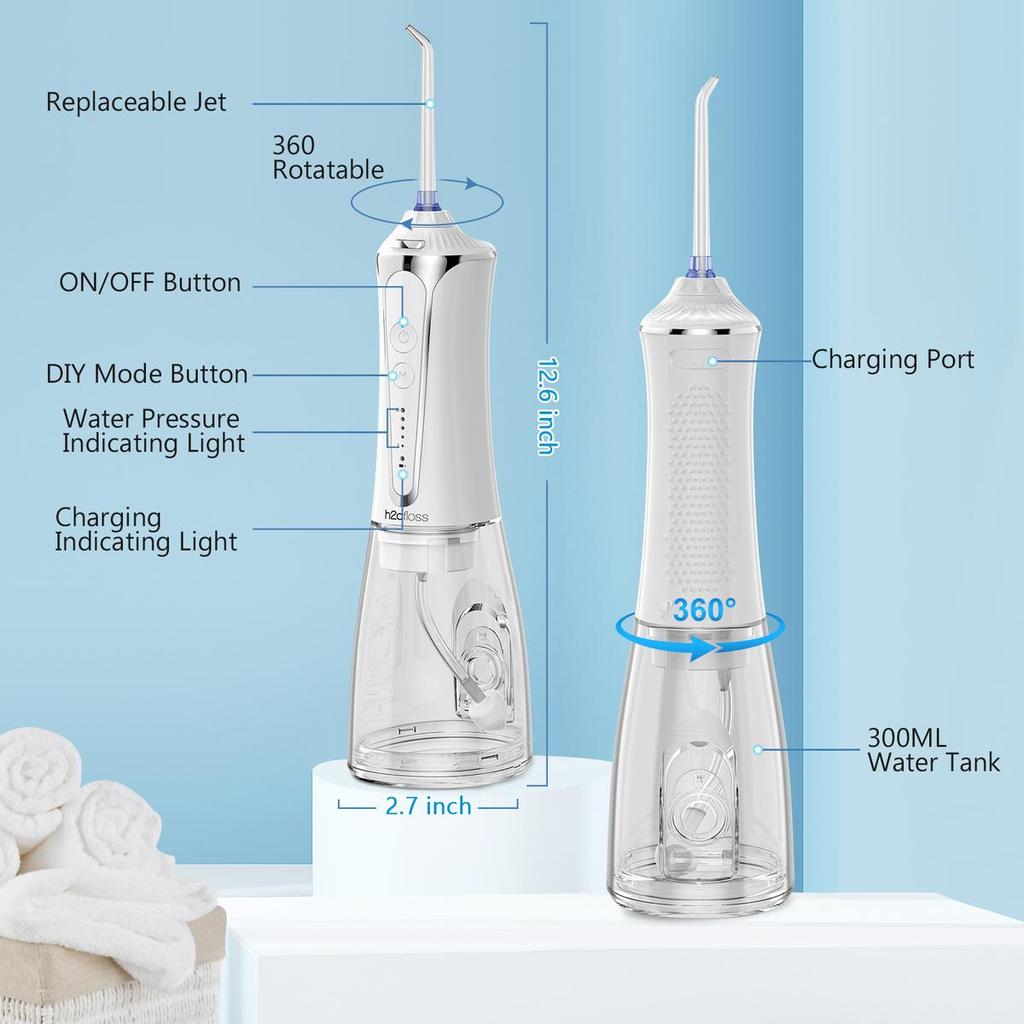 H2ofloss- flosser น้ําแบบพกพาแบบชาร์จไฟได้ & Oral Irrigator – ถังเก็บน้ํา 300ML, แท็บเล็ตเพื่อฟันขาวของคุณ, โหมดทําความสะอาด 5 โหมด, กันน้ํา IPX7