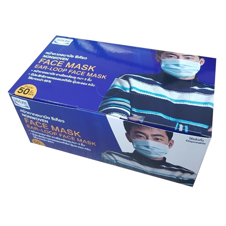 Sekure หน้ากากอนามัยใช้ครั้งเดียว ชนิดคล้องหู พื้นเขียว กล่องละ 50 ชิ้น