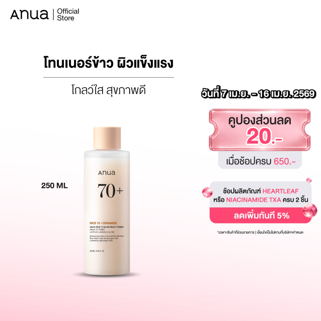 Anua Rice 70 Glow Milky Toner อานัว โทนเนอร์ข้าว เนื้อน้ำนม ผิวโกลว์กระจ่างใส ผิวกลาสสกิ น ผิวนุ่มชุ่มชื้น แข็งแรง 250ml